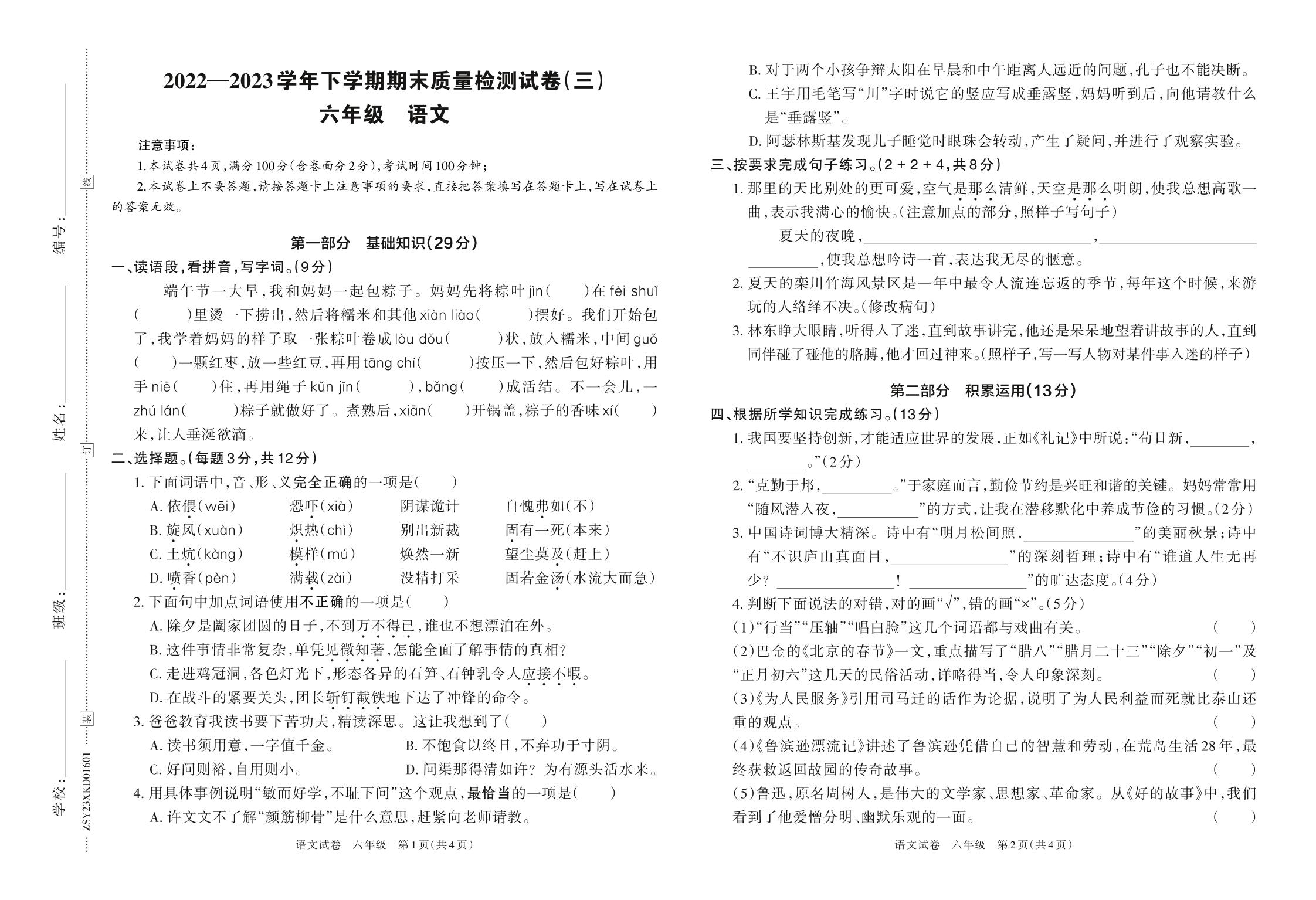 河南省洛阳市栾川县2022—2023学年下学期期末质量检测试卷(三)六年级语文(人教版)