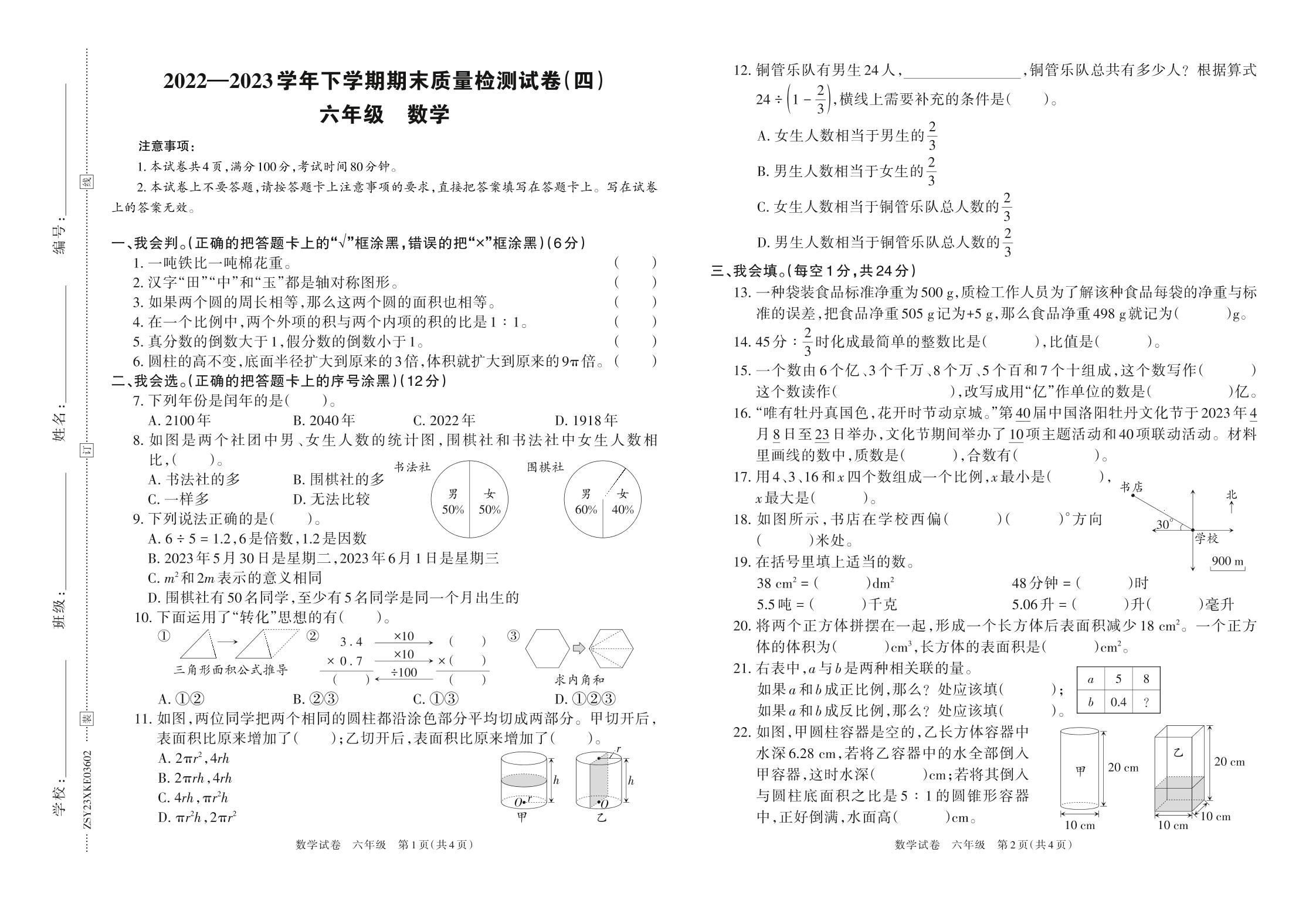 河南省洛阳市栾川县2022—2023学年下学期期末质量检测试卷(四)六年级数学(苏教版)