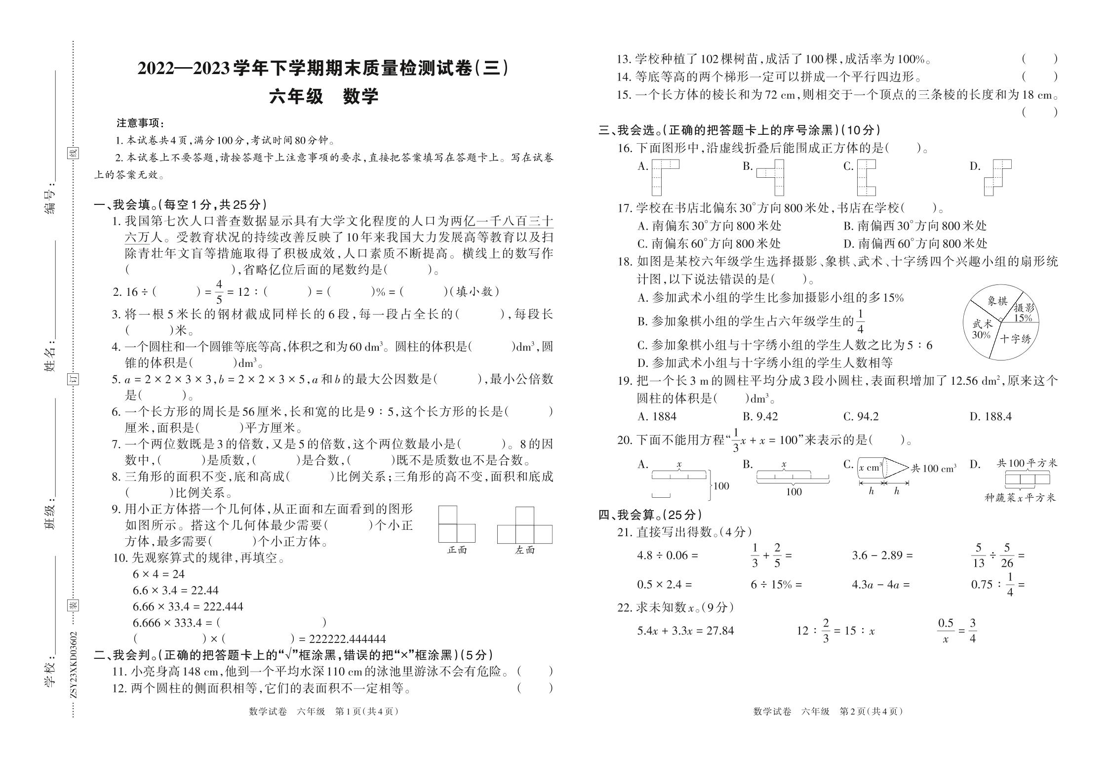 河南省洛阳市栾川县2022—2023学年下学期期末质量检测试卷(三)六年级数学(苏教版)