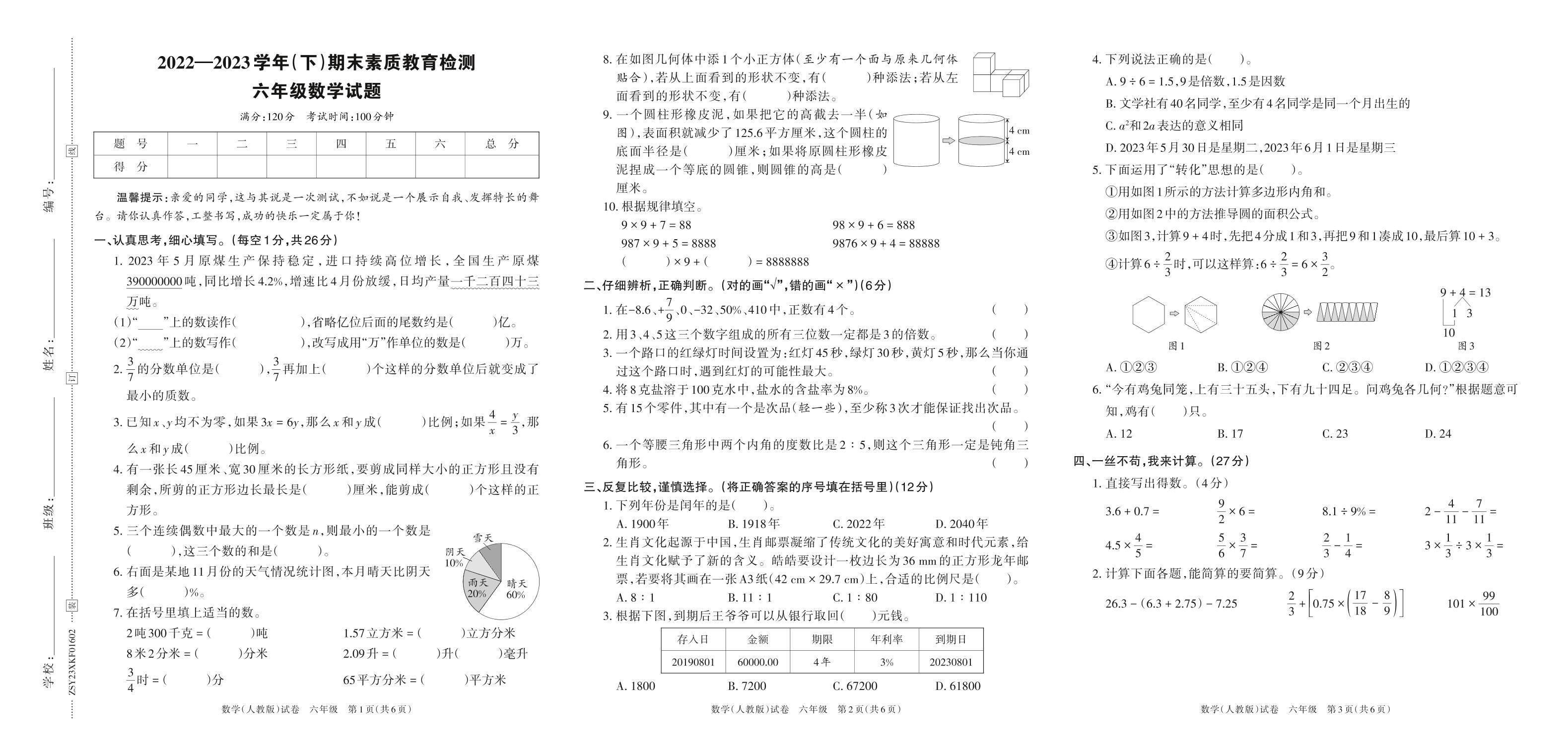河南省焦作市孟州市2022—2023学年(下)期末素质教育检测试题六年级数学(人教版)