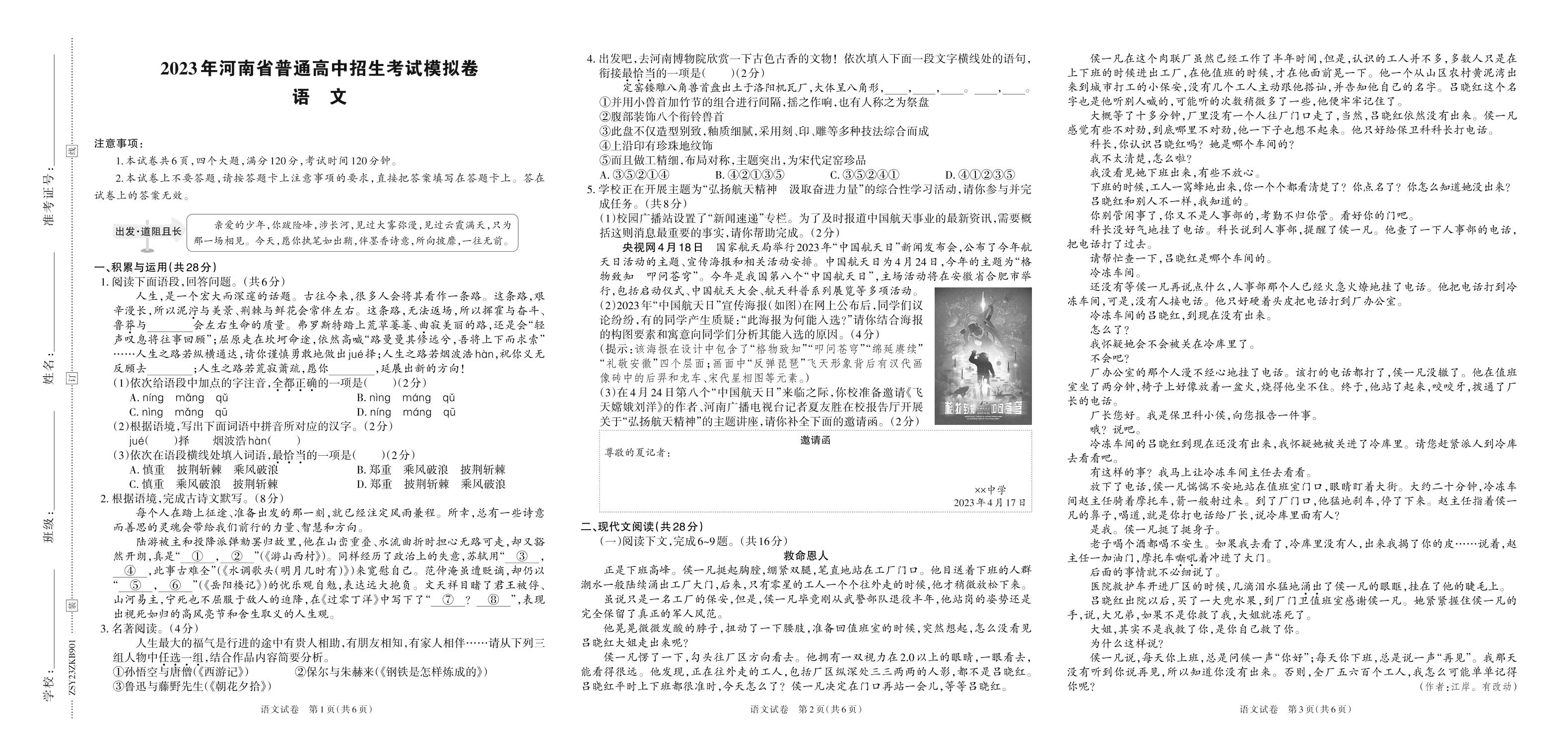 河南省2023年普通高中招生考试模拟卷(B)·语文