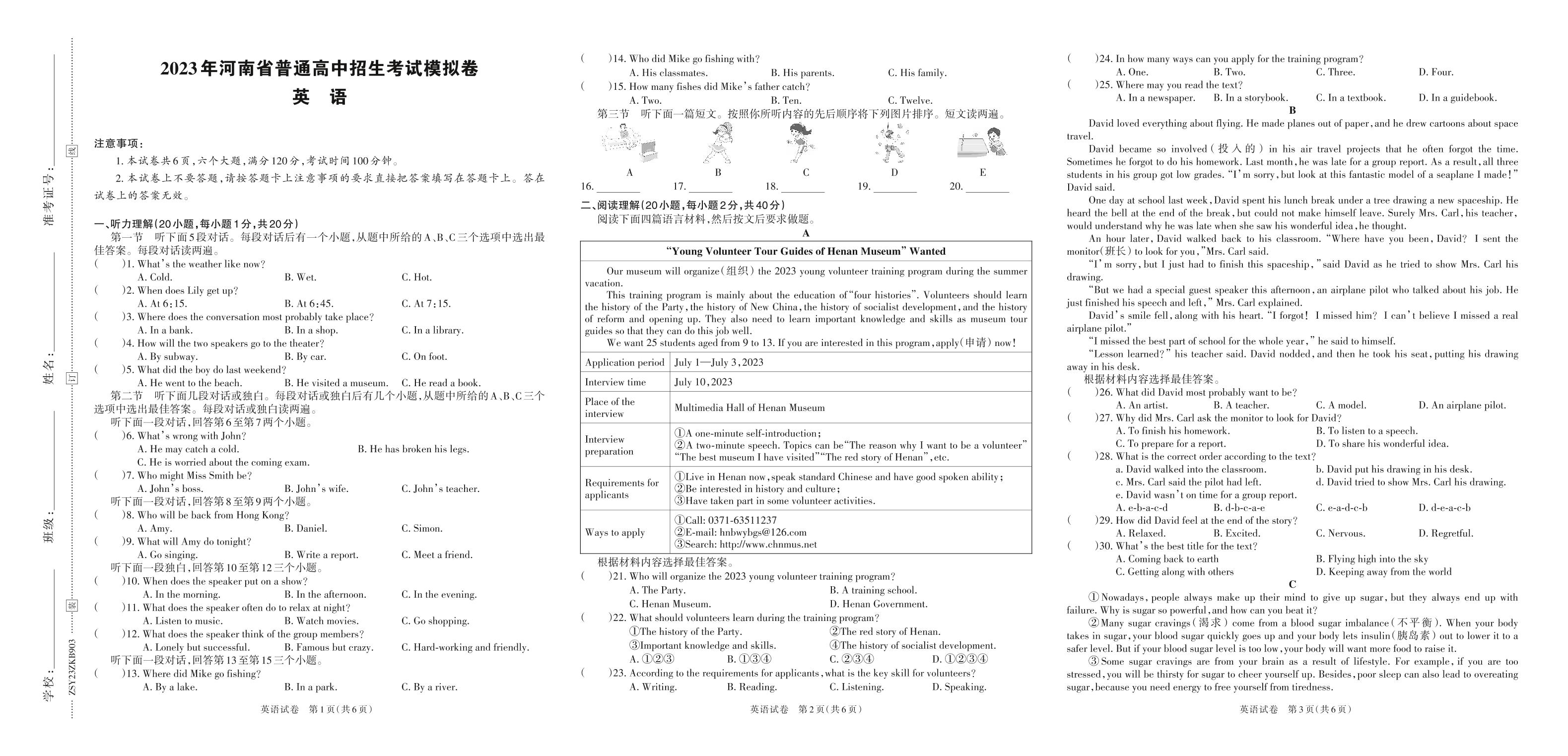 河南省2023年普通高中招生考试模拟卷(B)·英语
