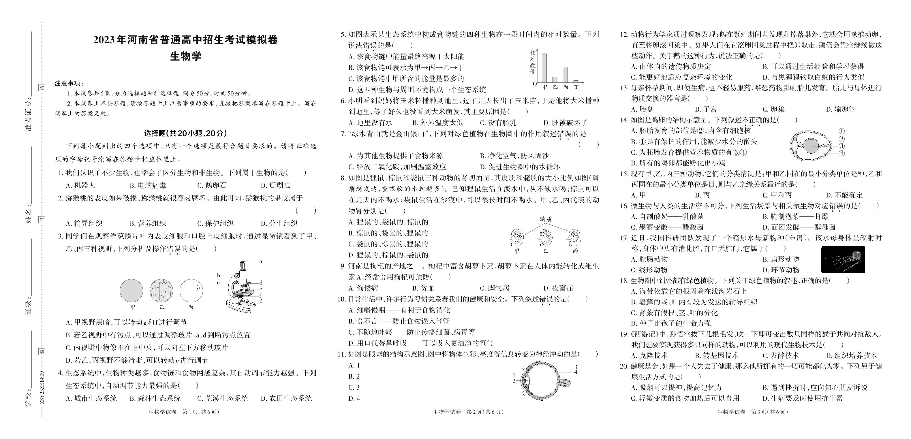 河南省2023年普通高中招生考试模拟卷(B)·生物