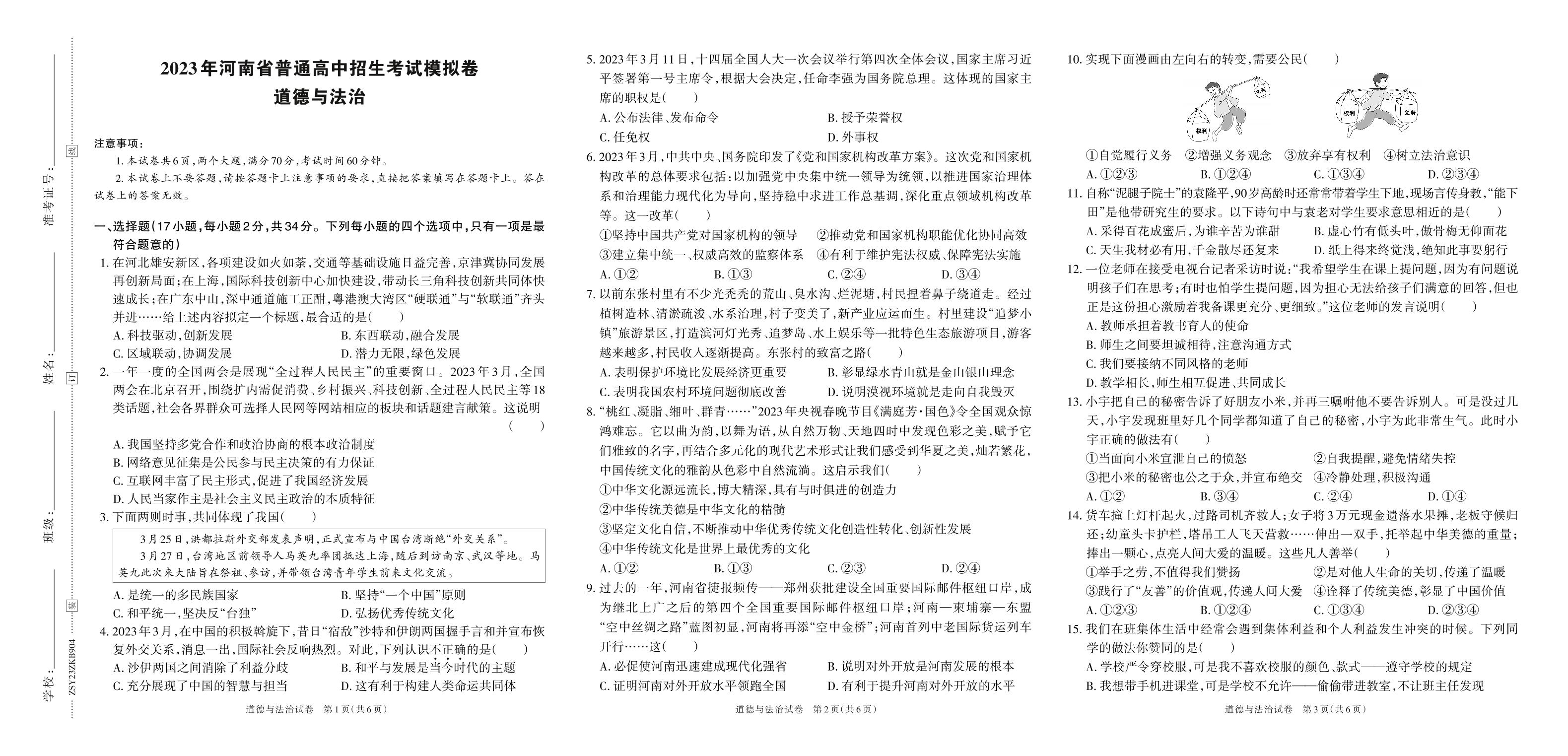 河南省2023年普通高中招生考试模拟卷(B)·道德与法治