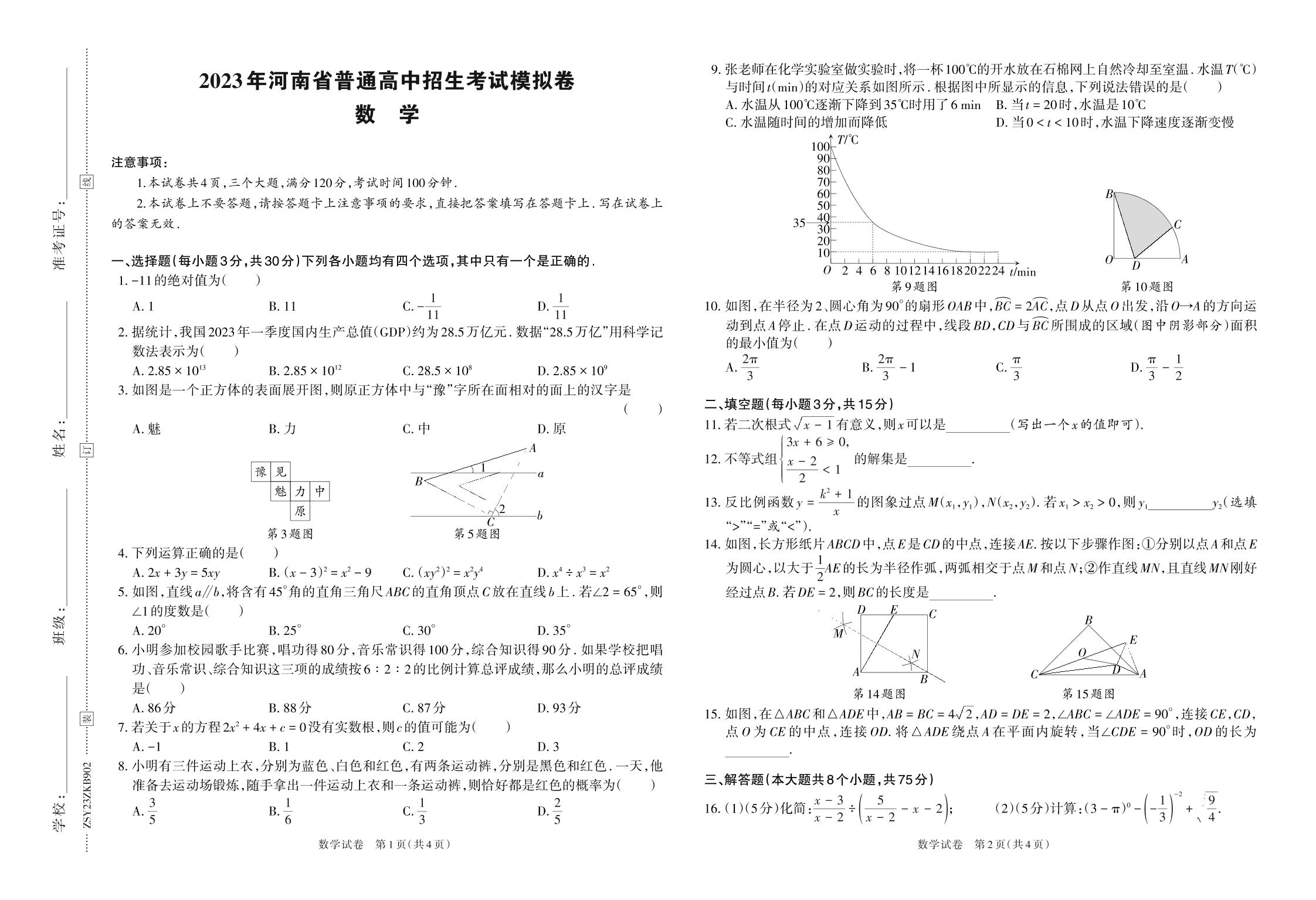 河南省2023年普通高中招生考试模拟卷(B)·数学