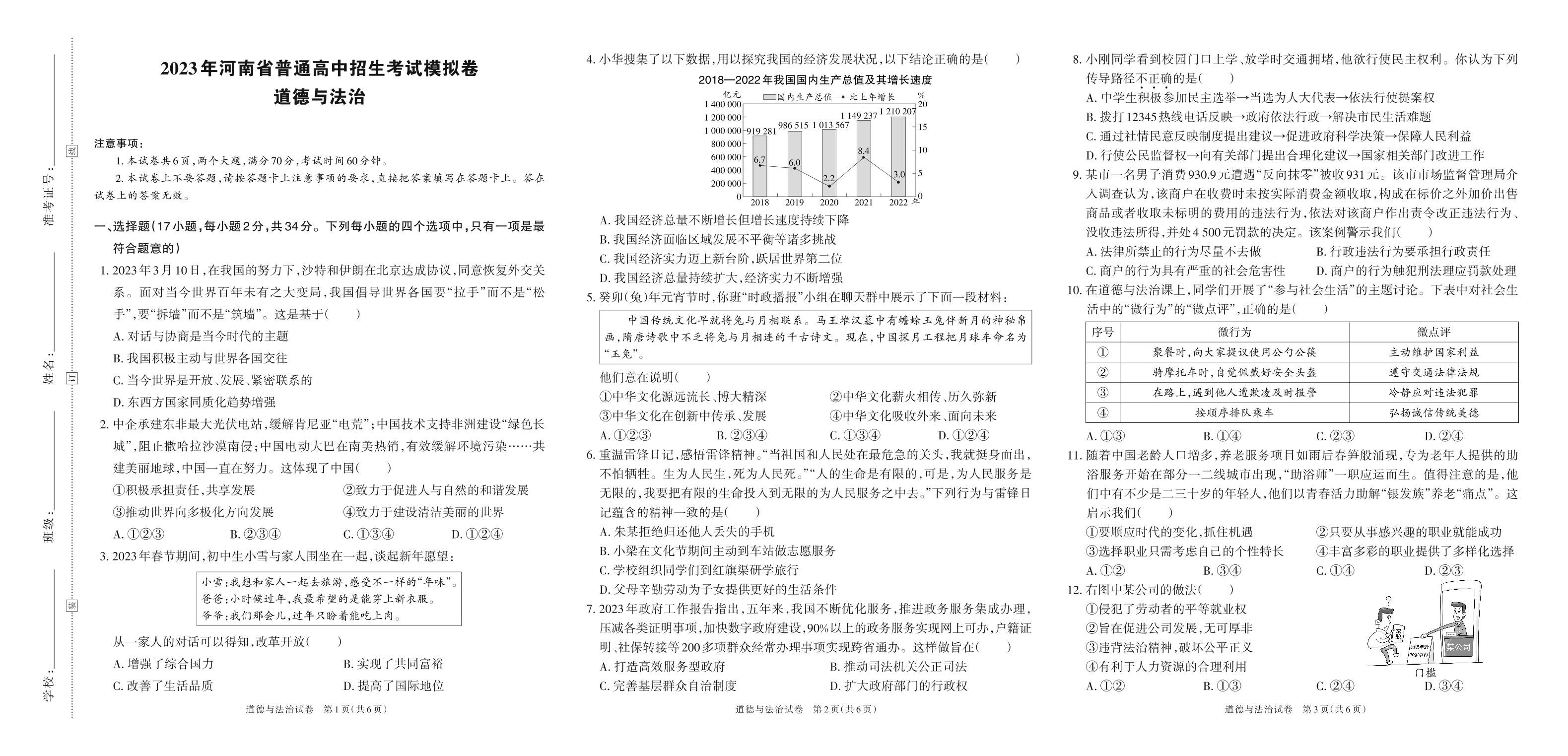 河南省鹤壁市淇滨中学2023年普通高中招生考试模拟卷·道德与法治