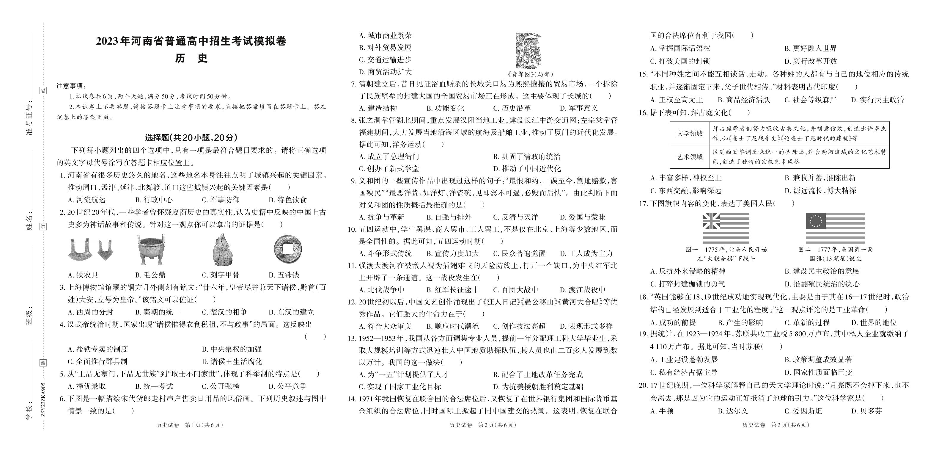 河南省2023年普通高中招生考试模拟卷(A)·历史