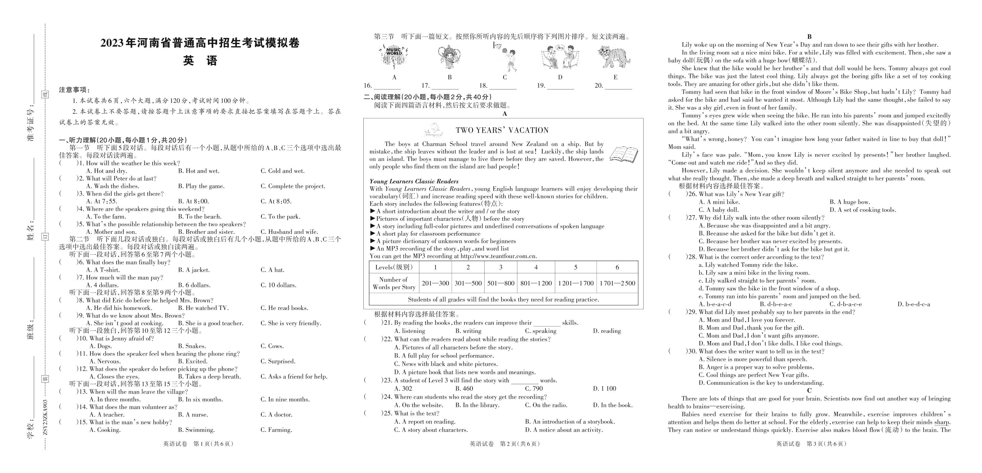 河南省2023年普通高中招生考试模拟卷(A)·英语