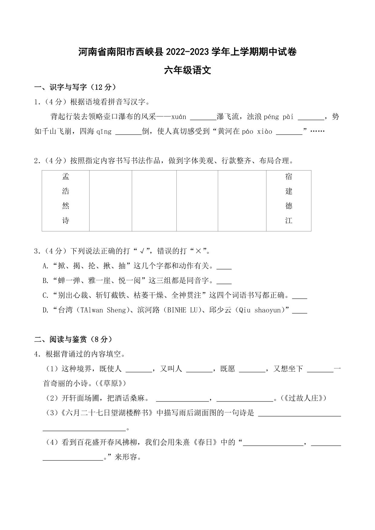 河南省南阳市西峡县2022-2023学年上学期期中试卷六年级语文(人教版)