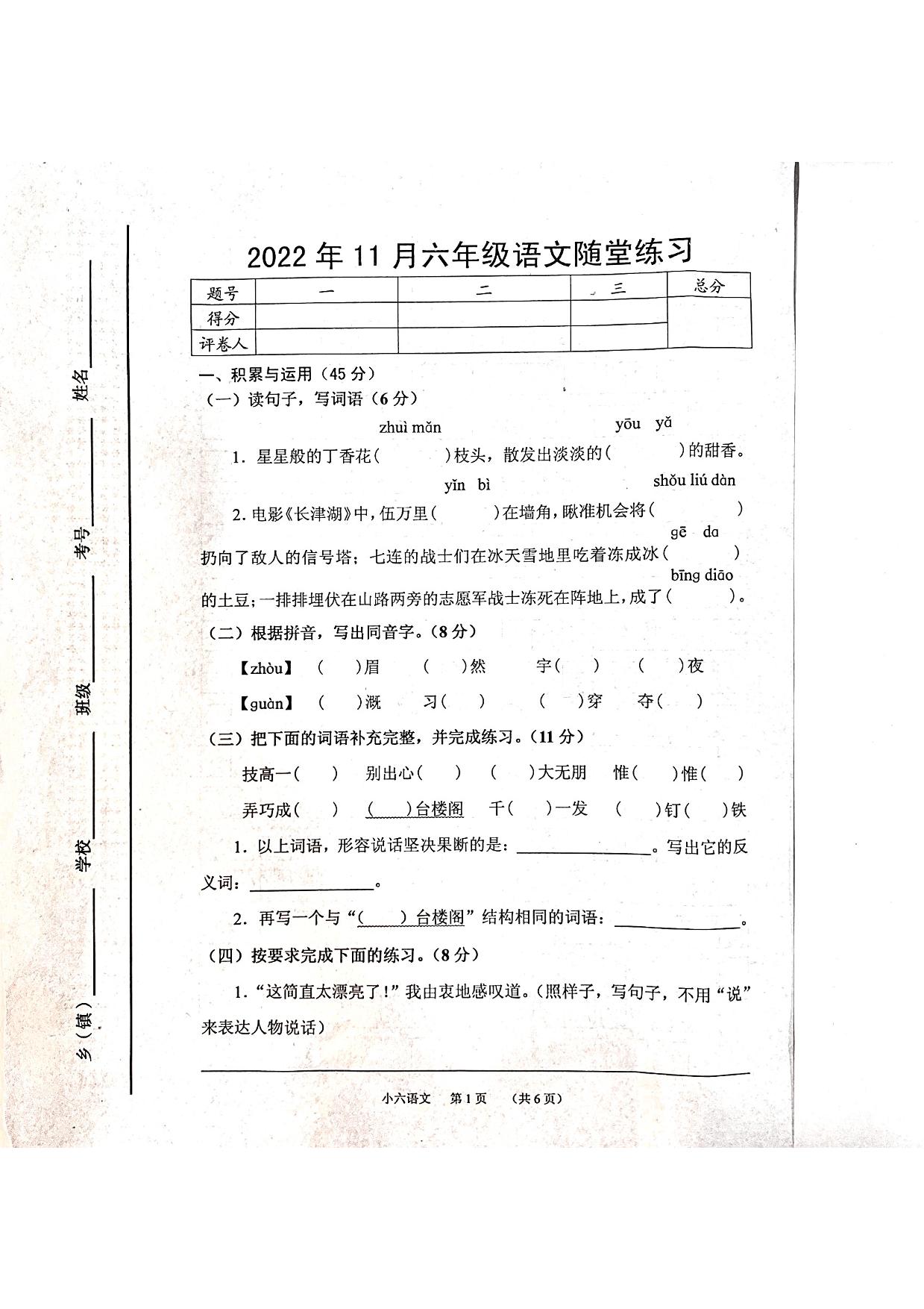 河南省南阳市宛城区2022-2023学年上学期期中试题六年级语文(人教版)