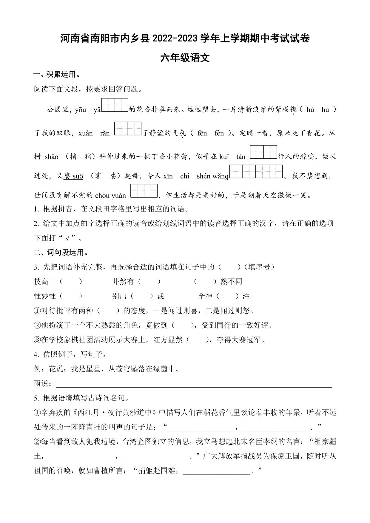 河南省南阳市内乡县2022-2023学年上学期期中考试试卷六年级语文(人教版)