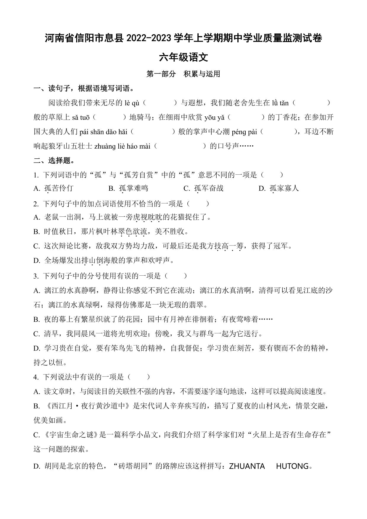 河南省信阳市息县2022-2023学年上学期期中学业质量监测试卷六年级语文(人教版)