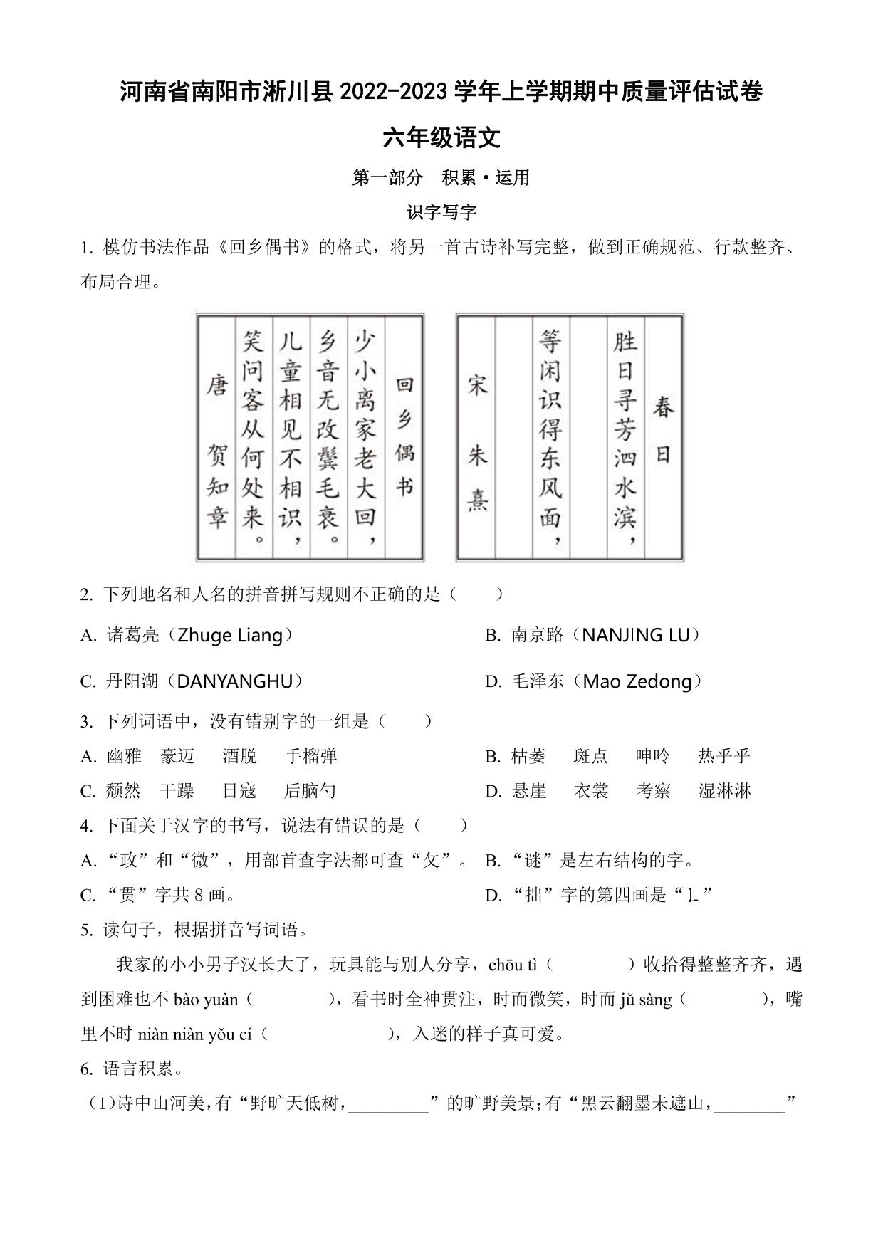 河南省南阳市淅川县2022-2023学年上学期期中质量评估试卷六年级语文(人教版)