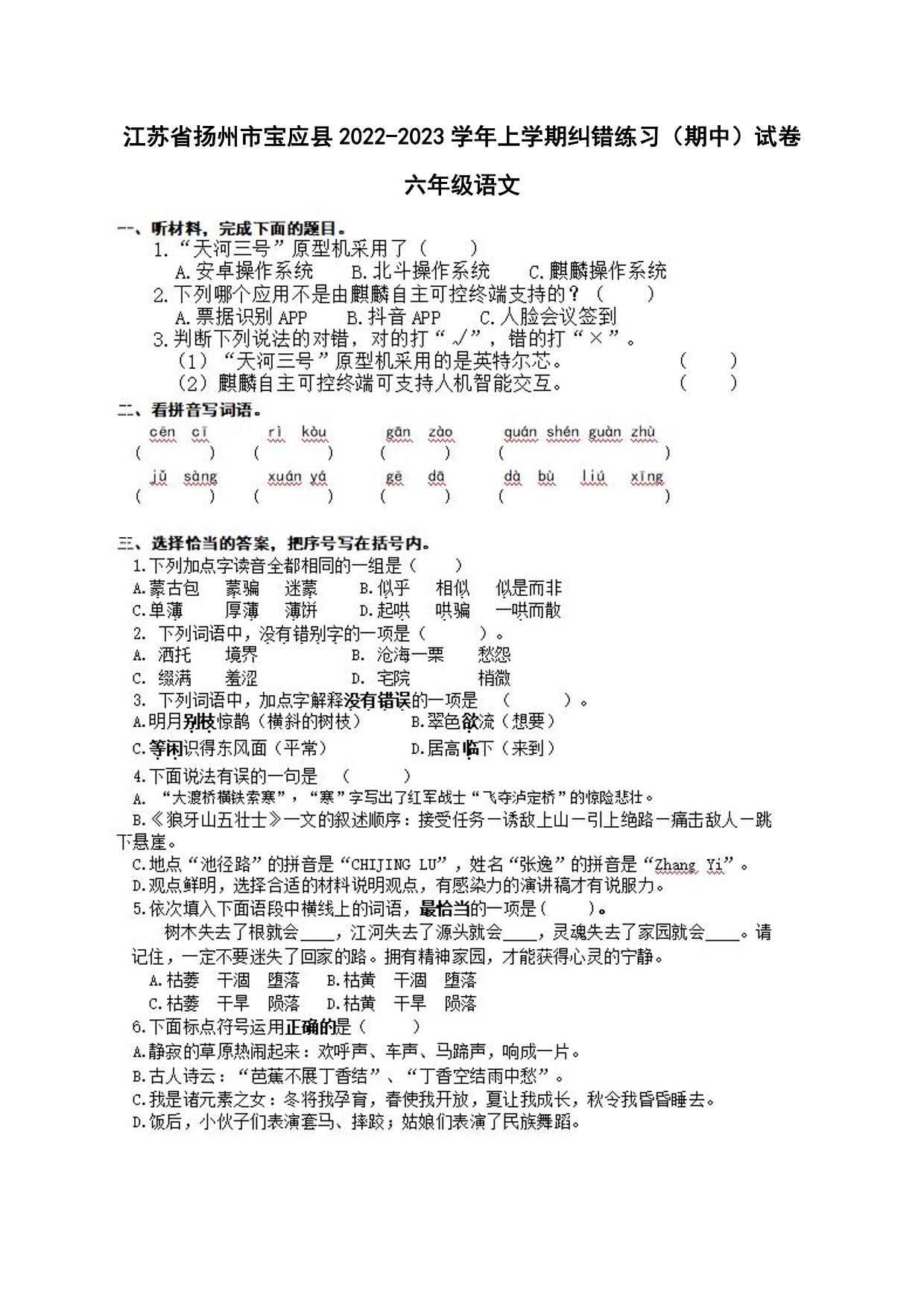 江苏省扬州市宝应县2022-2023学年上学期纠错练习(期中)试卷六年级语文(人教版)