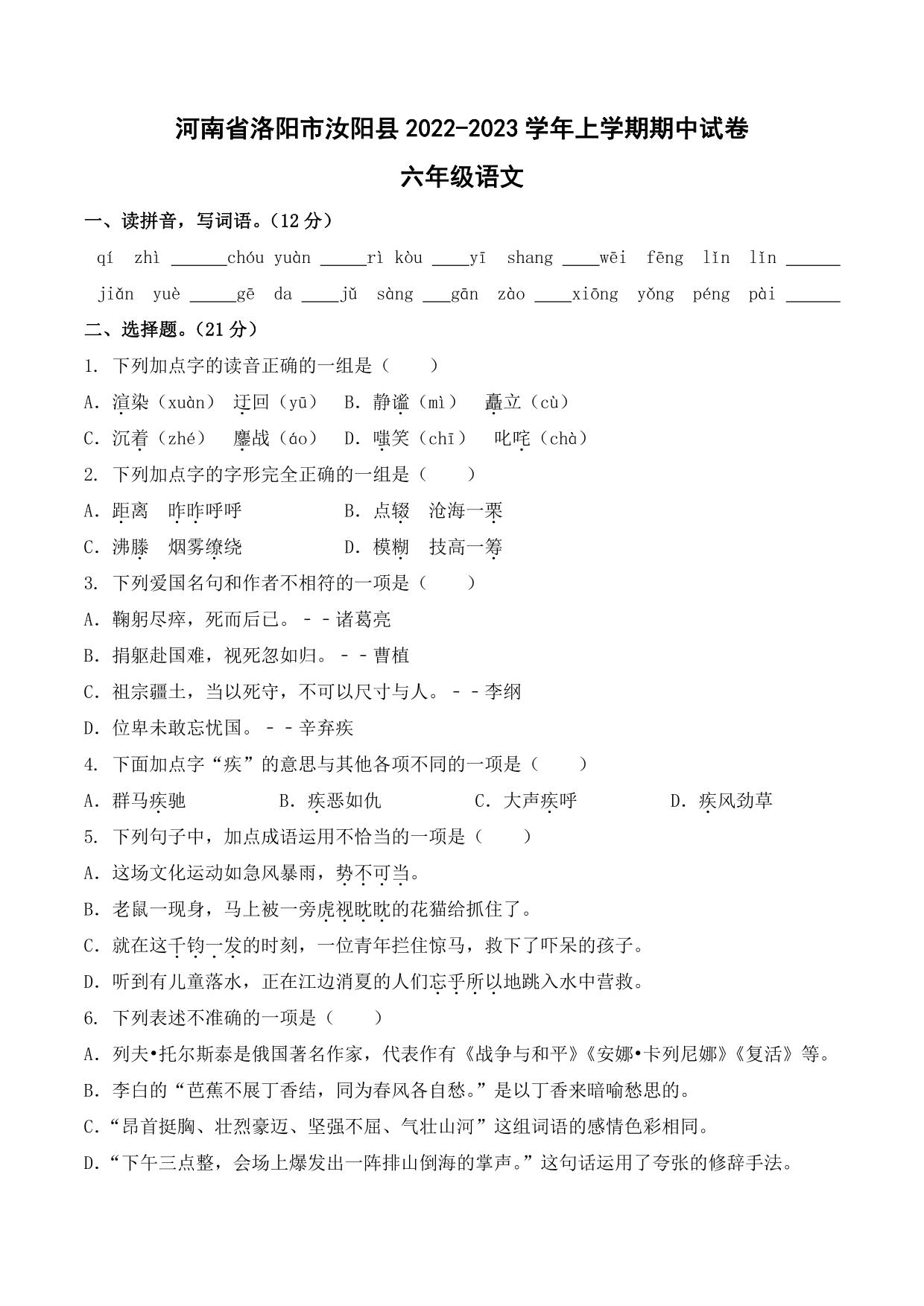 河南省洛阳市汝阳县2022-2023学年上学期期中试卷六年级语文(人教版)