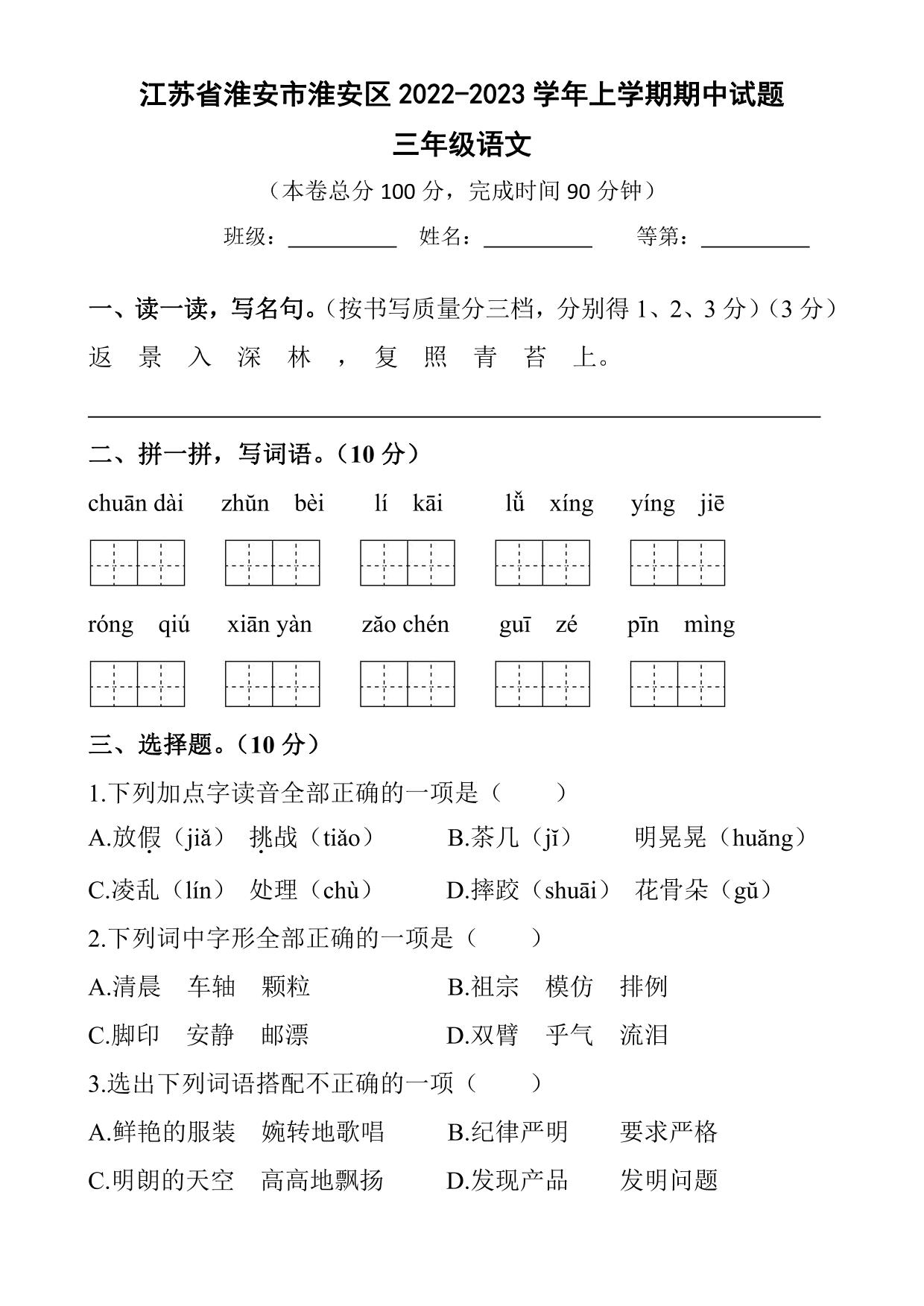 江苏省淮安市淮安区2022-2023学年上学期期中试题三年级语文(人教版)