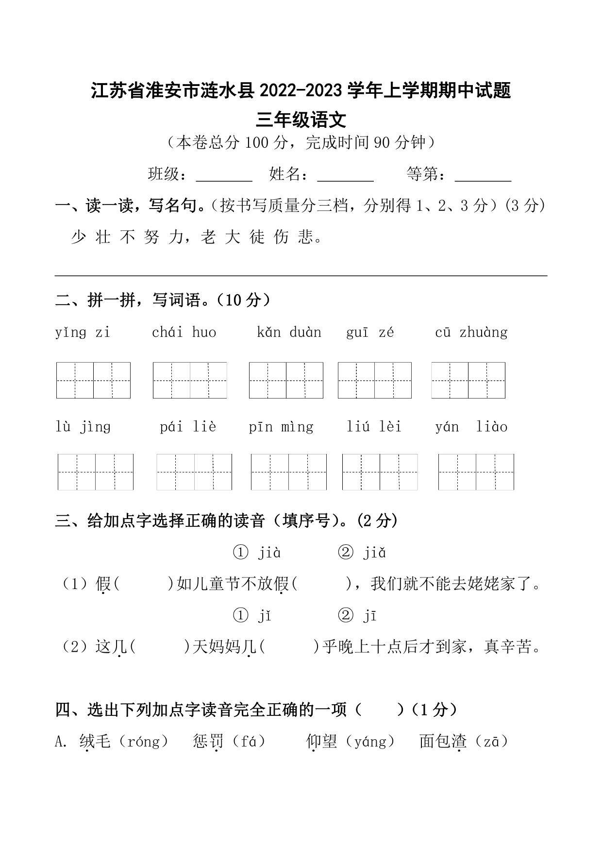 江苏省淮安市涟水县2022-2023学年上学期期中试题三年级语文(人教版)