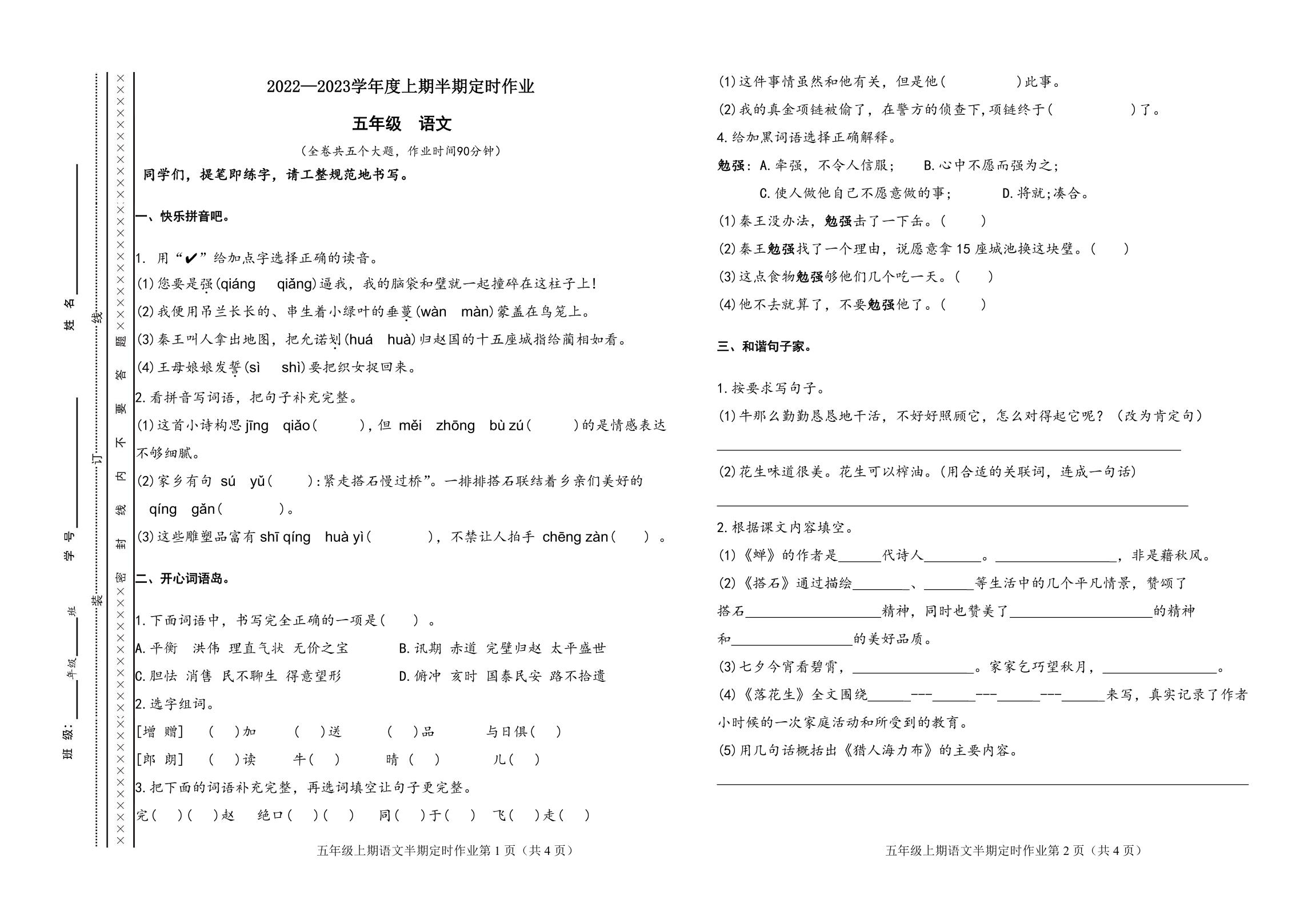 重庆市某小学2022-2023学年上学期期中定时试题五年级语文(人教版)