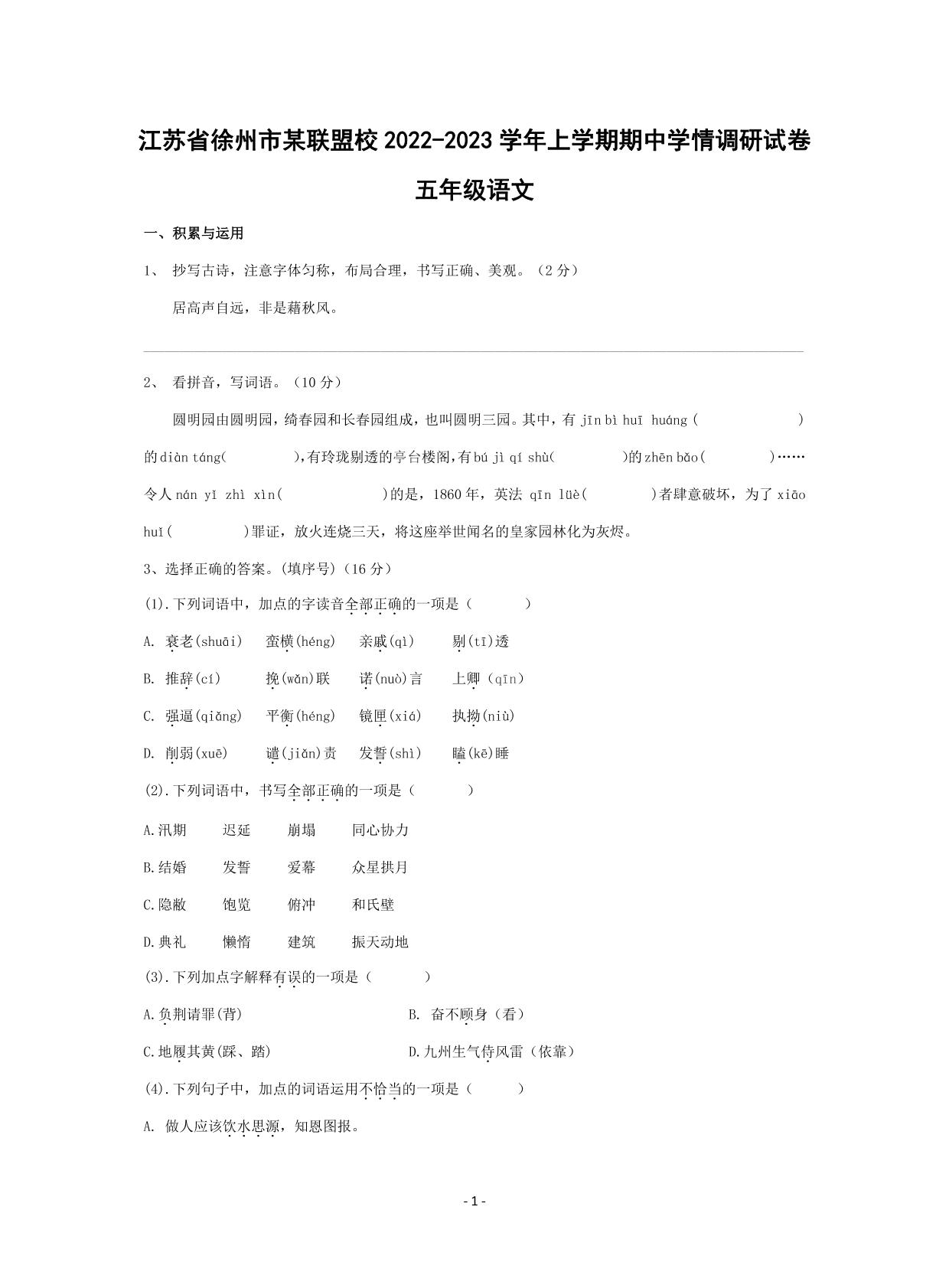 江苏省徐州市某联盟校2022-2023学年上学期期中学情调研试卷五年级语文(人教版)