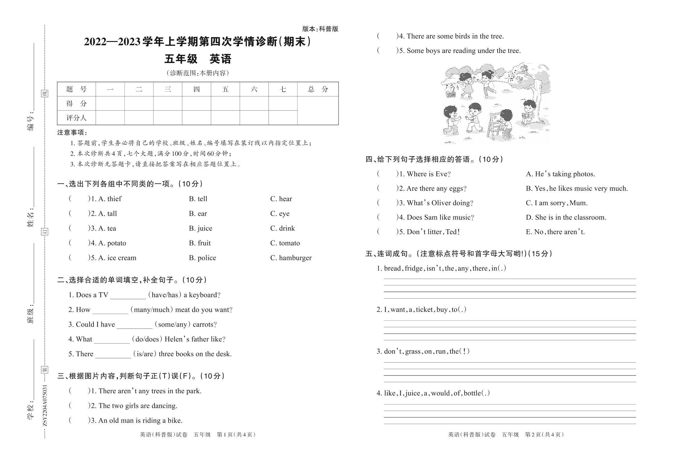 河南省驻马店市确山县第五小学2022-2023学年上学期第二次学情诊断卷(期中)试卷五年级英语(科普版)