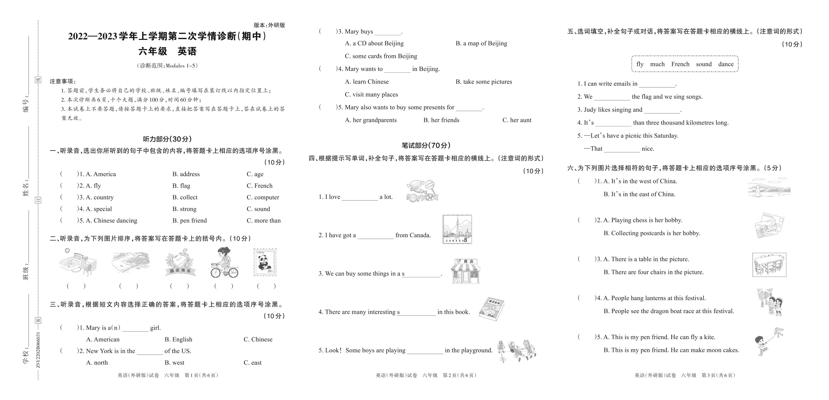 河南省洛阳市栾川县10余所乡镇小学2022-2023学年上学期第二次学情诊断卷(期中)六年级英语(外研版)