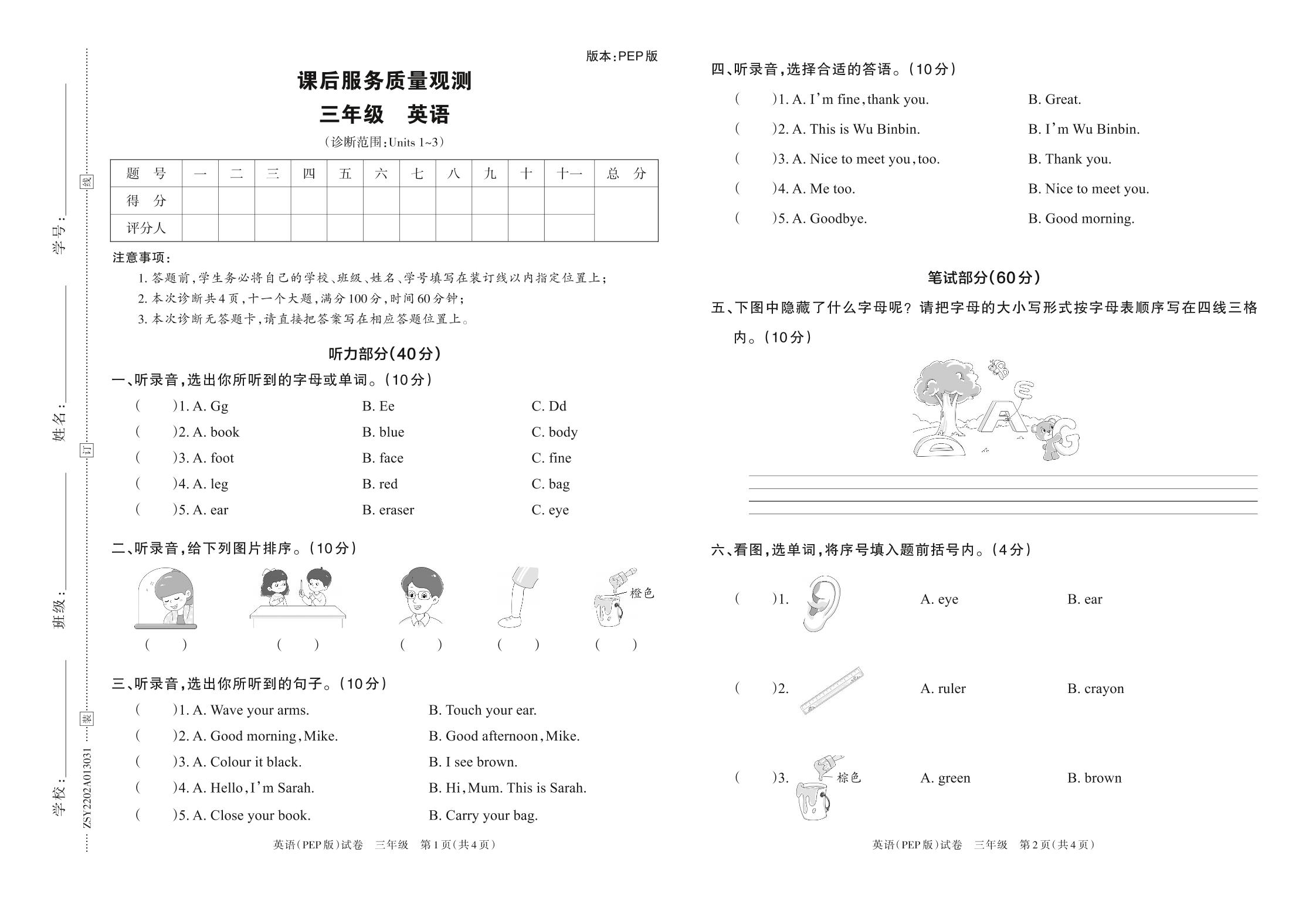 河南省林州市长安路小学2022-2023学年上学期第二次学情诊断卷(期中)三年级英语(人教PEP版)