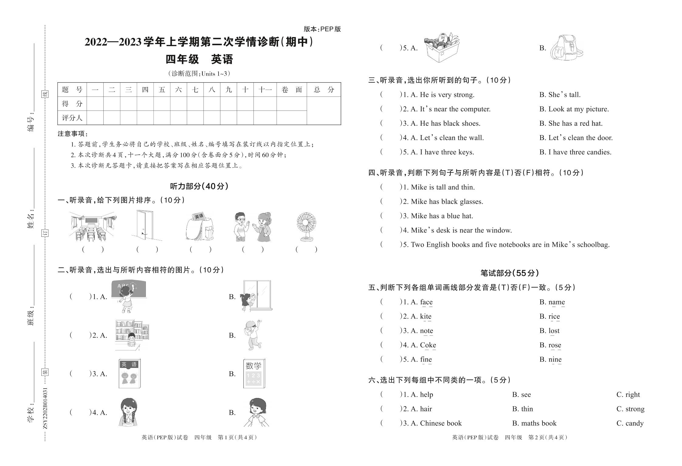 河南省中牟县20所学校2022-2023学年上学期第二次学情诊断卷(期中)四年级英语(人教PEP版)