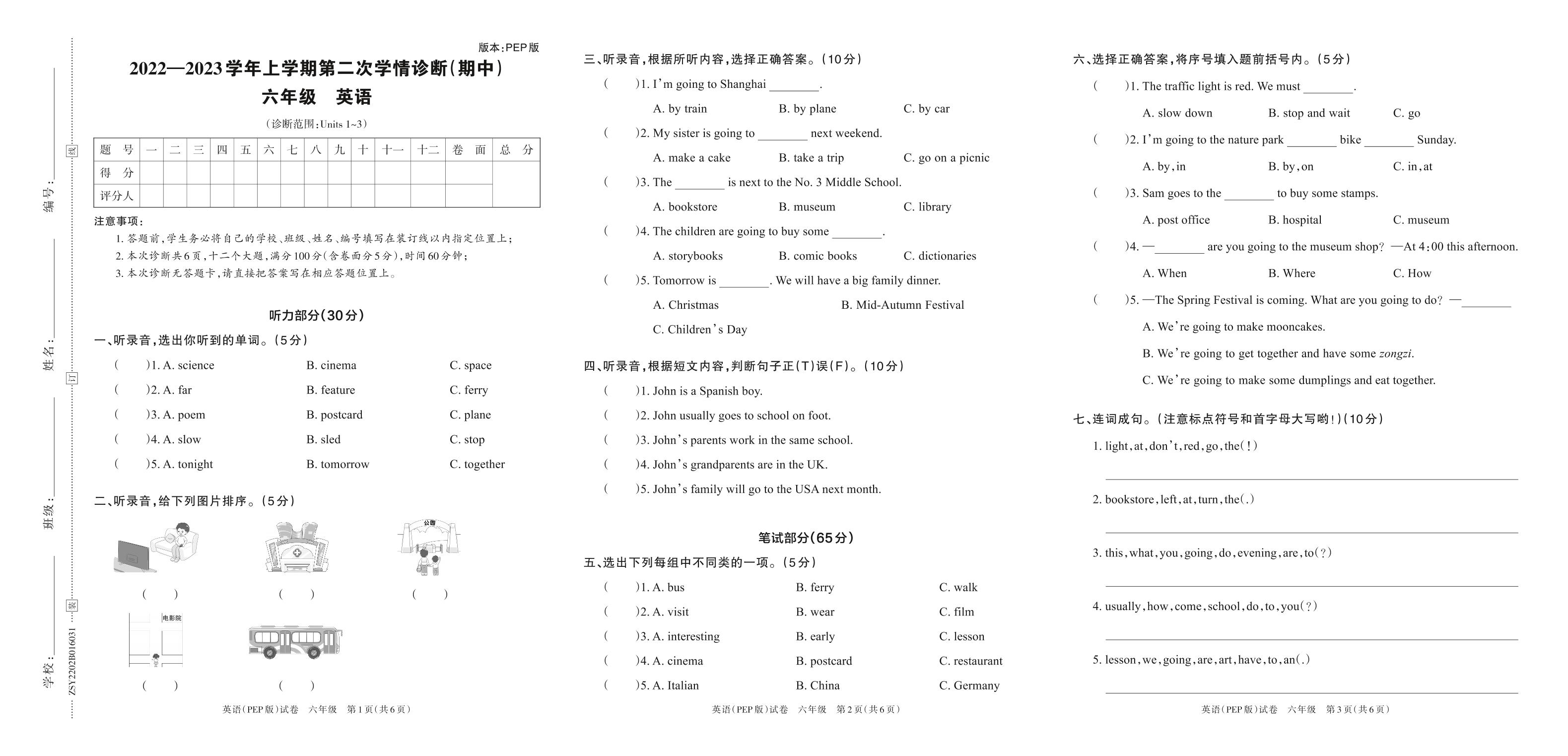 河南省中牟县20所学校2022-2023学年上学期第二次学情诊断卷(期中)六年级英语(人教PEP版)