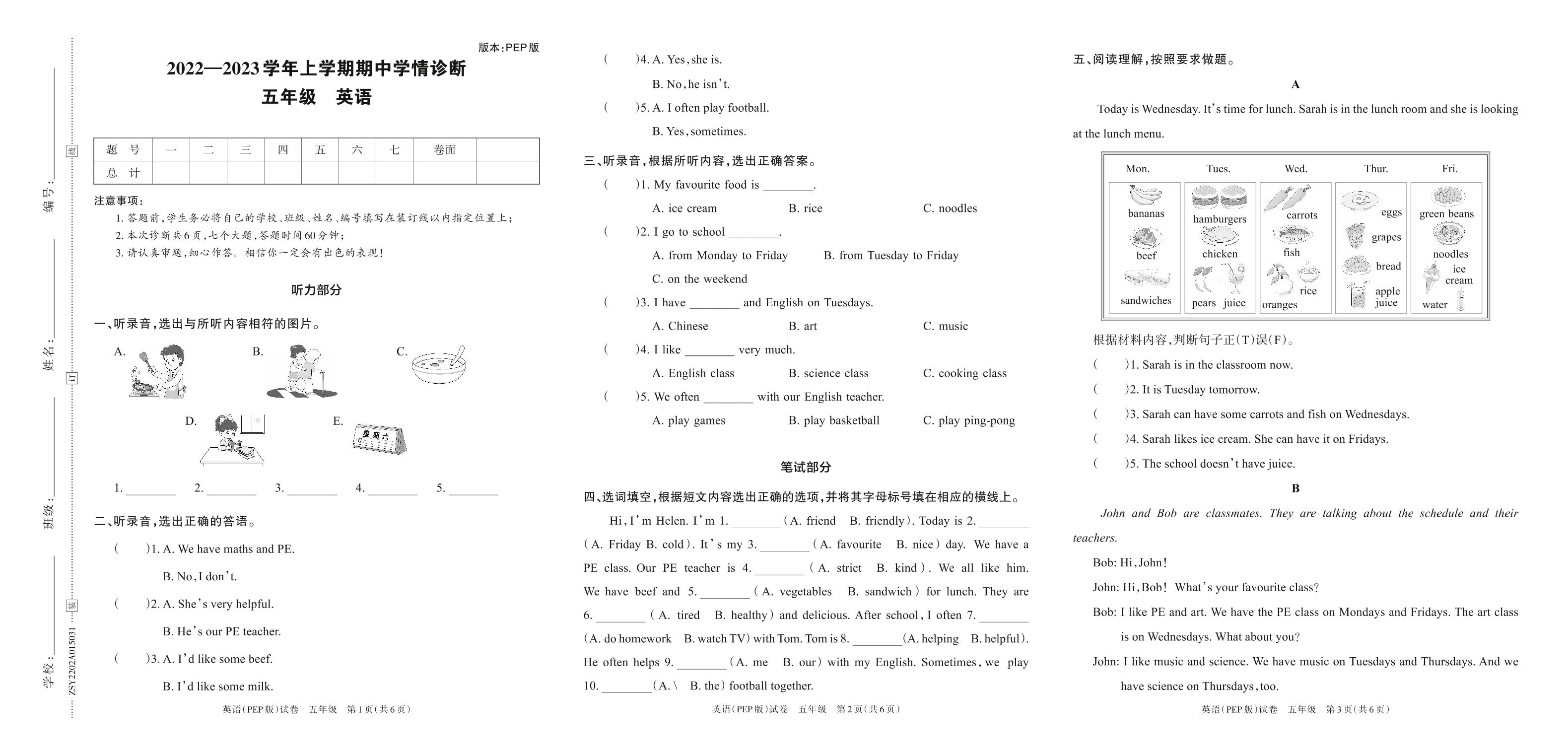 河南省中牟县姚家镇2022-2023学年上学期期中学情诊断卷五年级英语(人教PEP版)