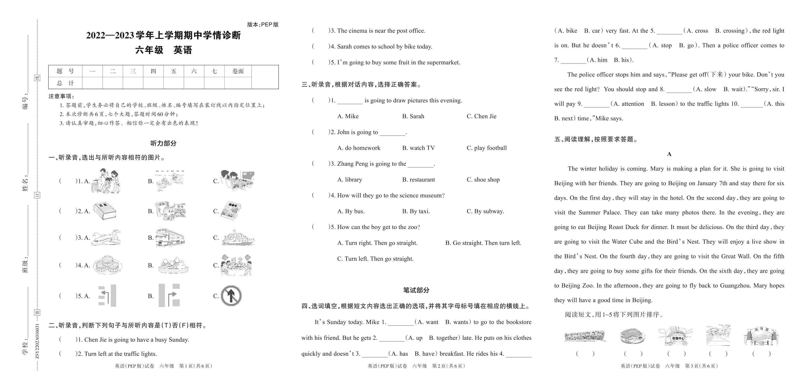 河南省中牟县姚家镇2022-2023学年上学期期中学情诊断卷六年级英语(人教PEP版)