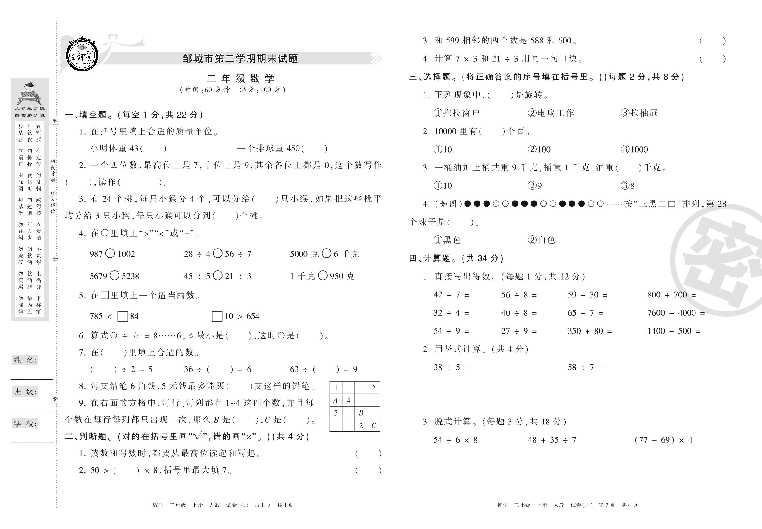 2015-2016学年第二学期邹城市二年级数学试卷(人教版)【6】