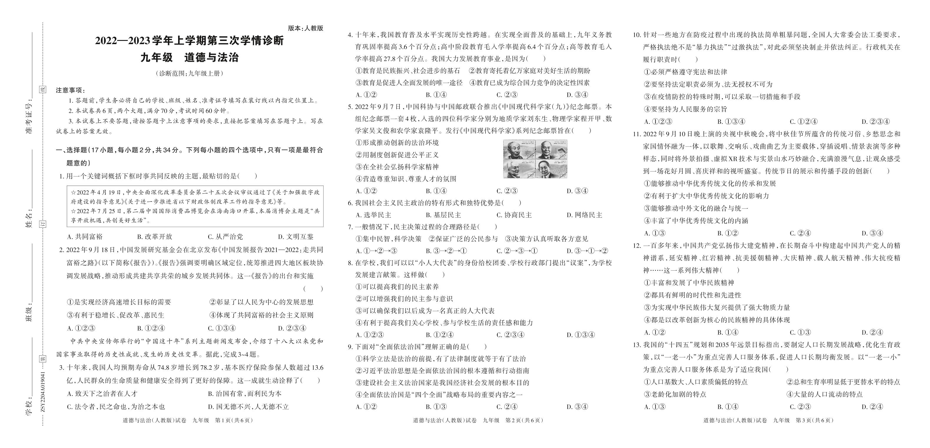 河南省洛阳市宜阳县2022-2023学年上学期第三次学情诊断卷九年级道德与法治(人教版)