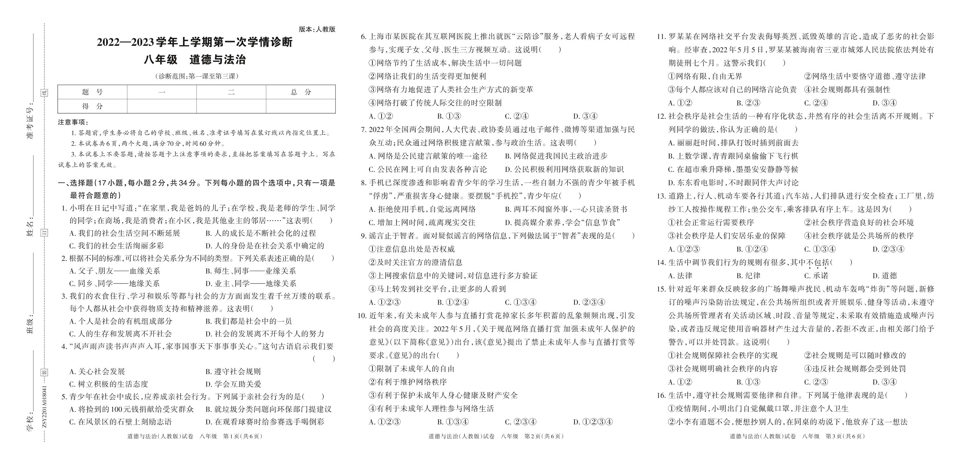河南省洛阳市嵩县城关一中2022-2023学年上学期第一次学情诊断卷八年级道德与法治(人教版)