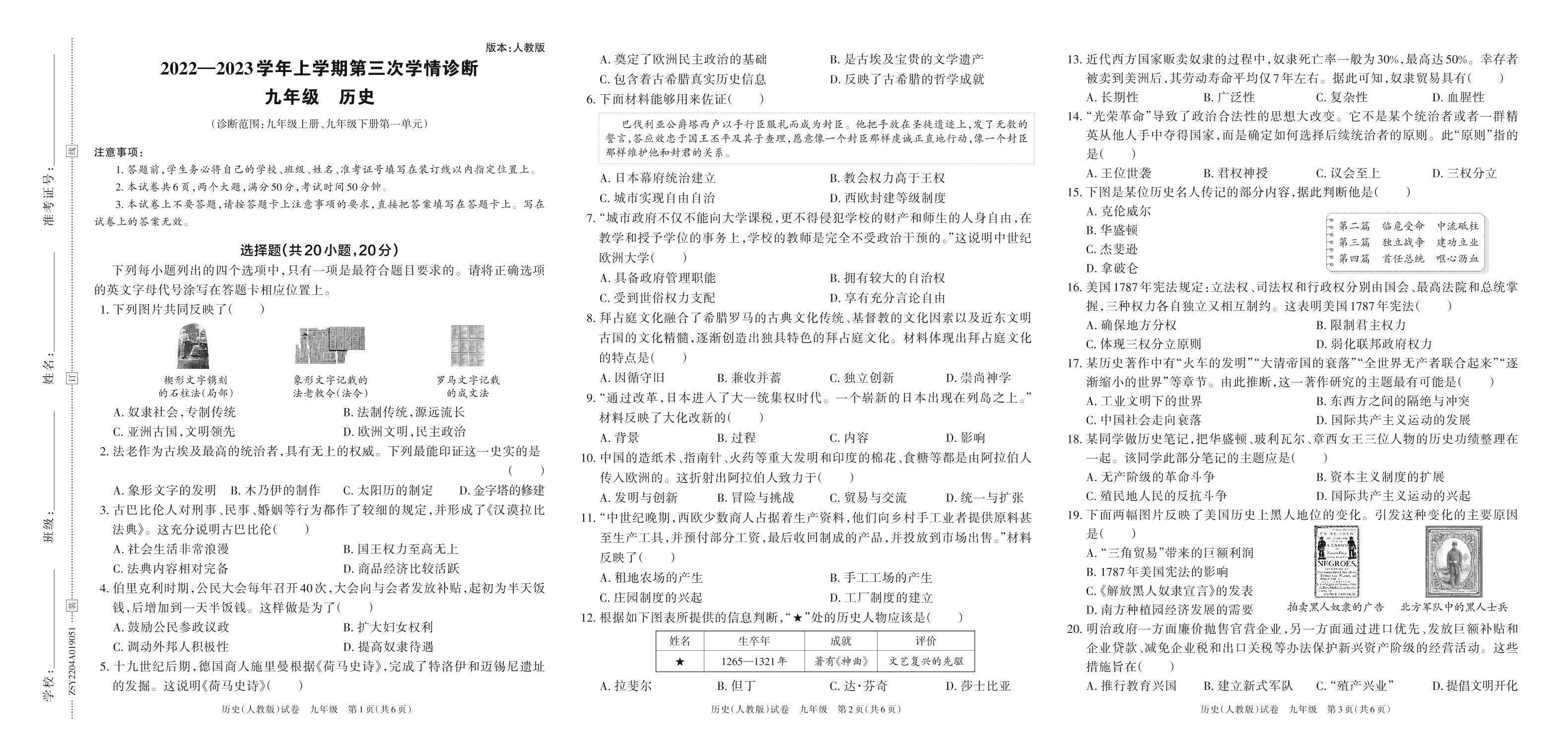河南省洛阳市宜阳县2022-2023学年上学期第三次学情诊断卷九年级历史(人教版)