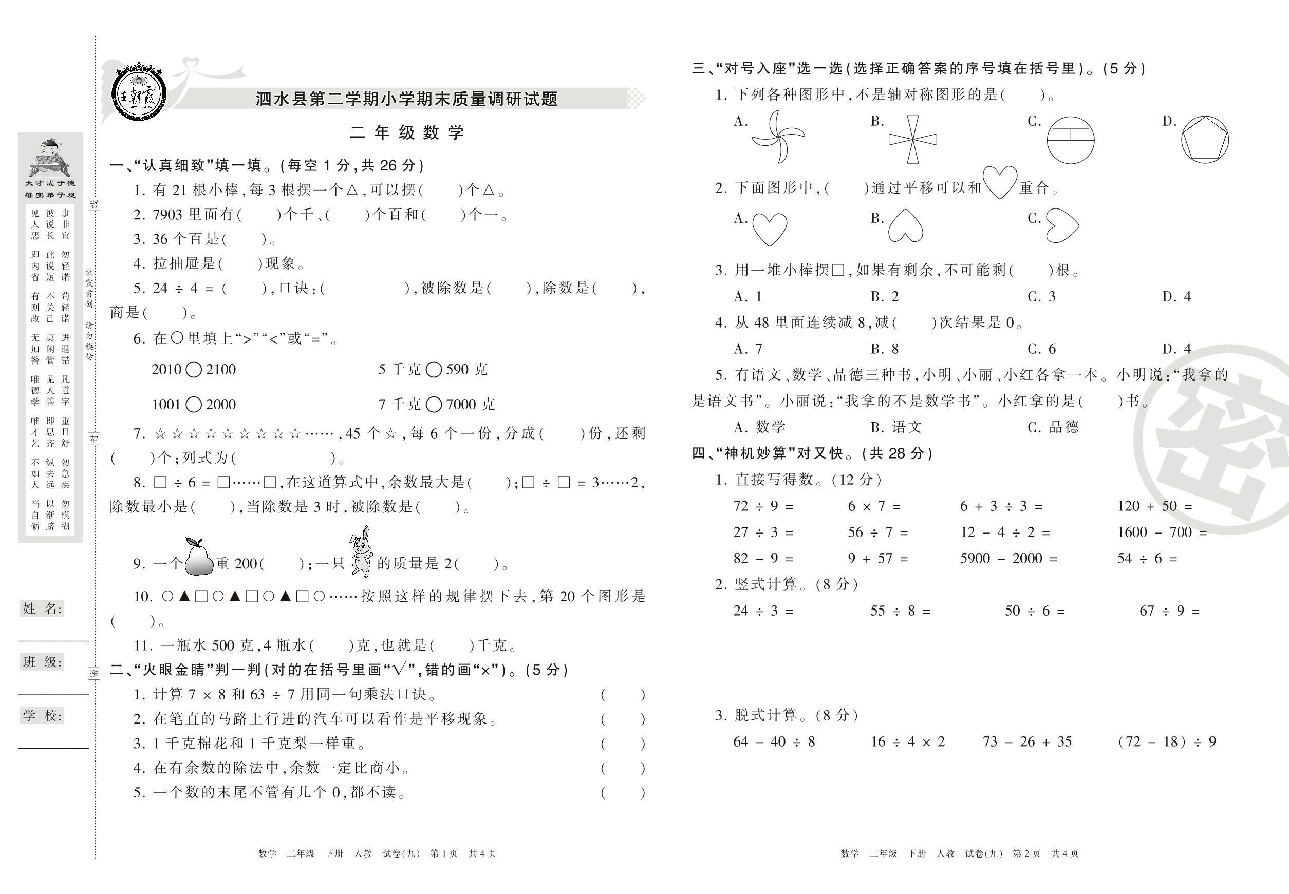 2015-2016学年第二学期济宁市泗水县二年级数学试卷(人教版)【9】