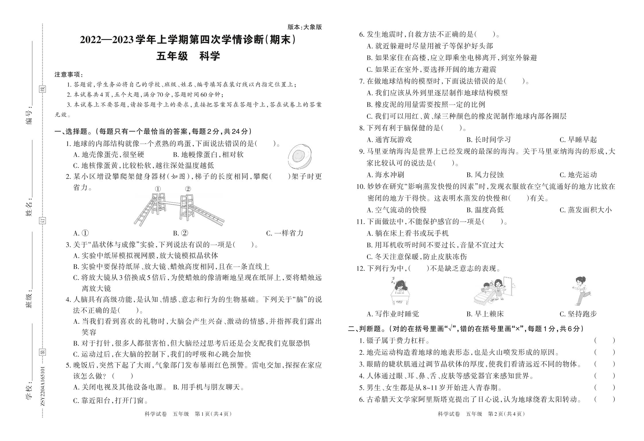 河南省洛阳市孟津第一实验小学2022-2023学年上学期第二次学情诊断卷(期中)五年级科学(大象版)