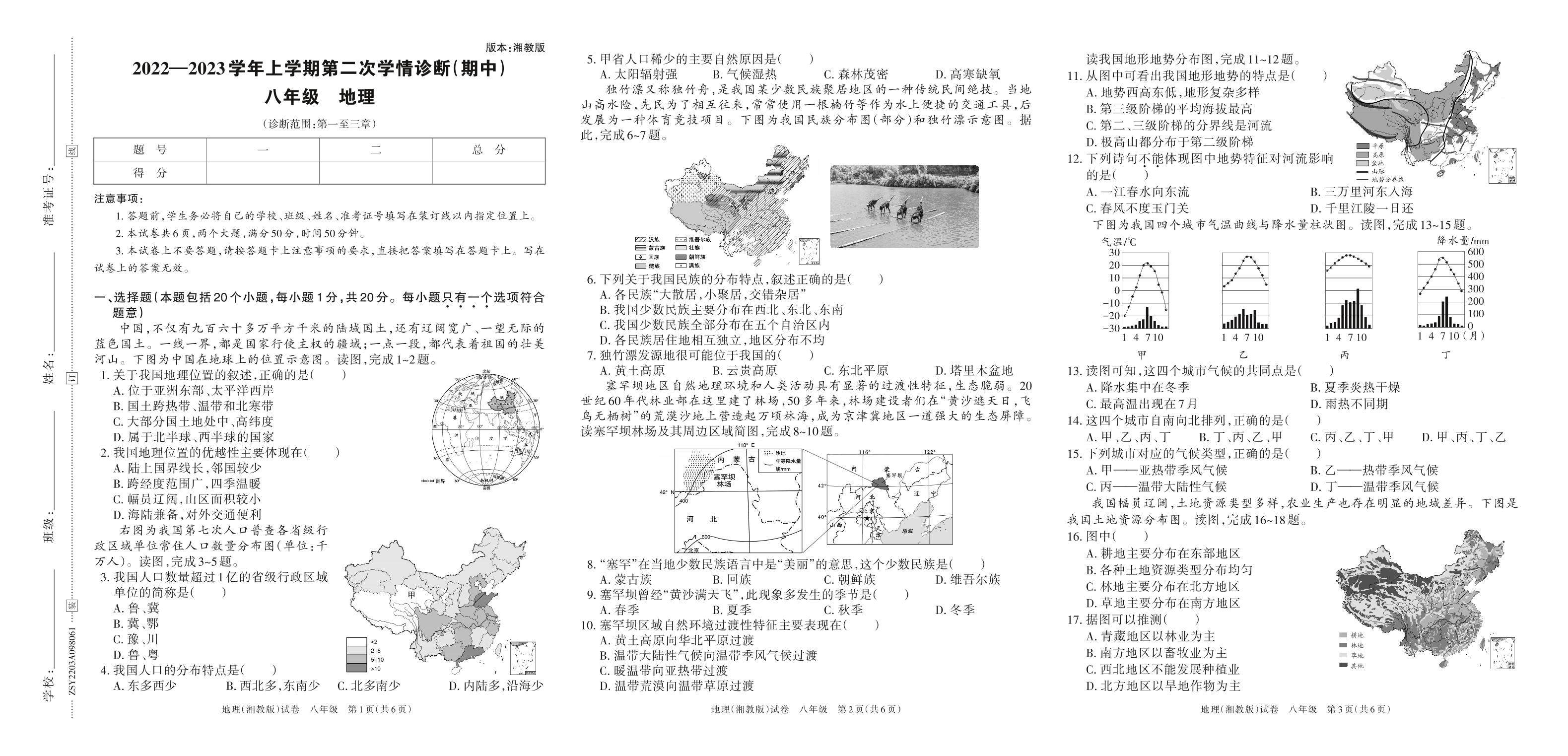 河南省林州红旗渠大道学校2022-2023学年上学期第二次学情诊断卷(期中)八年级地理(湘教版)