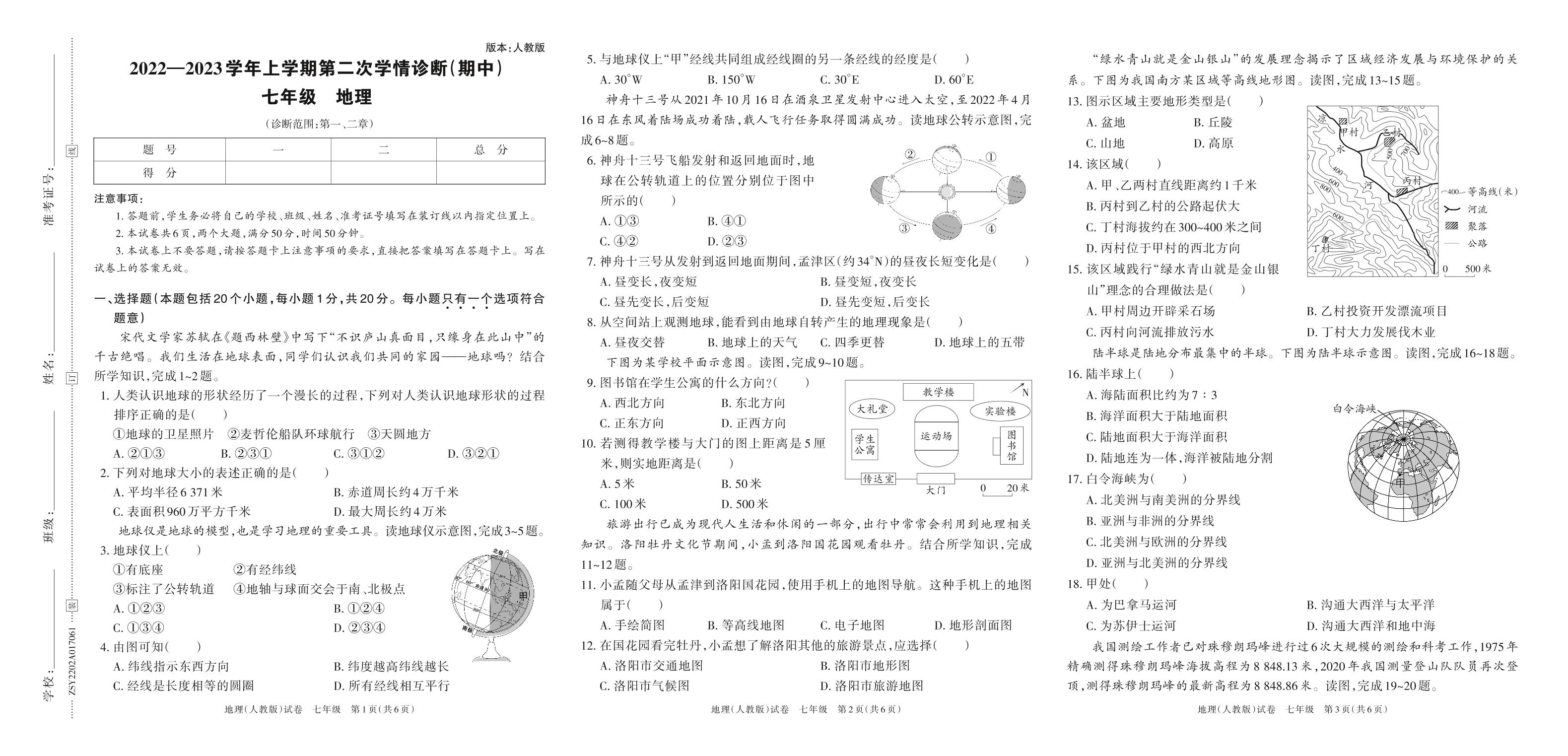 河南省洛阳市孟津县直中学2022-2023学年上学期第二次学情诊断卷(期中)七年级地理(人教版)