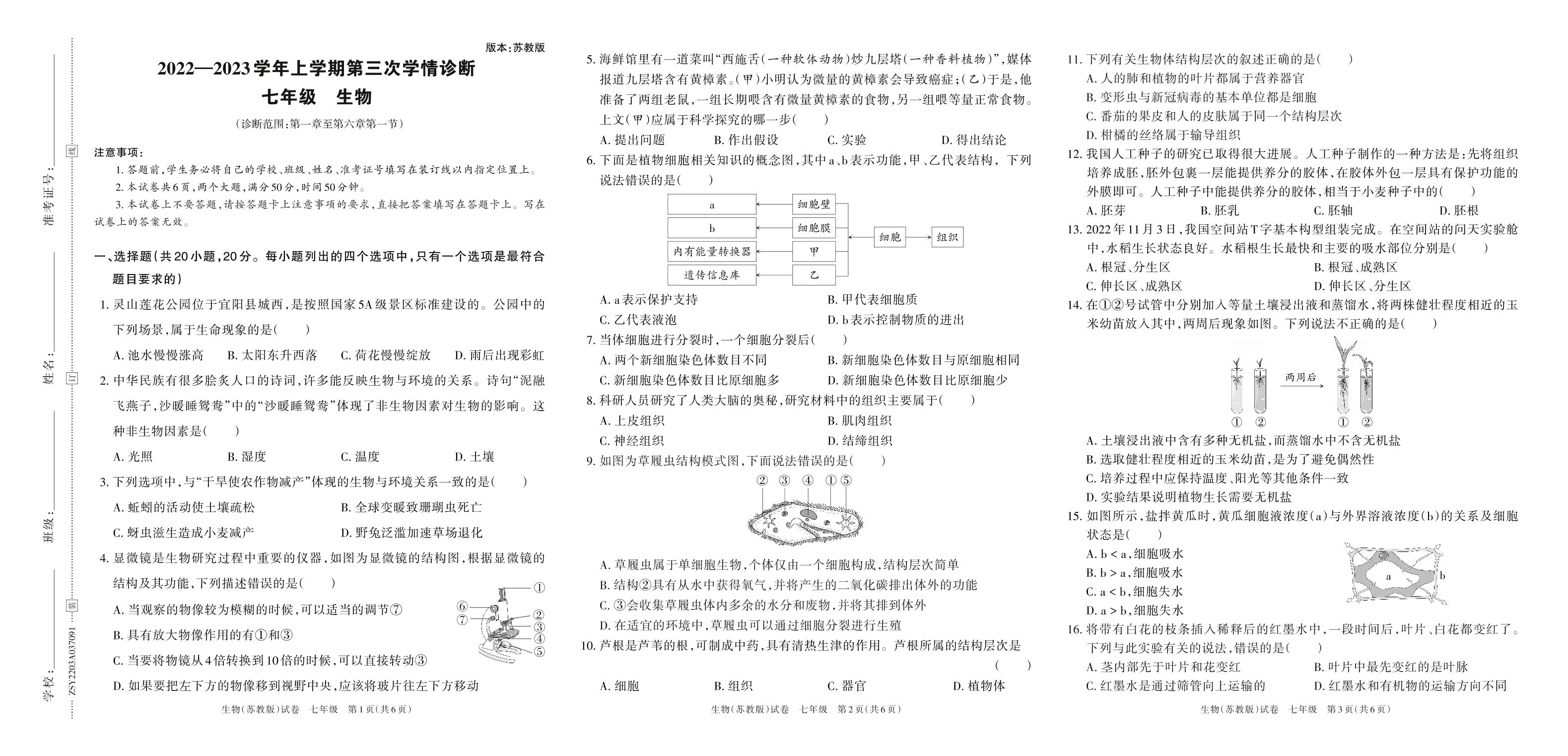 河南省洛阳市宜阳县2022-2023学年上学期第三次学情诊断卷七年级生物(苏教版)
