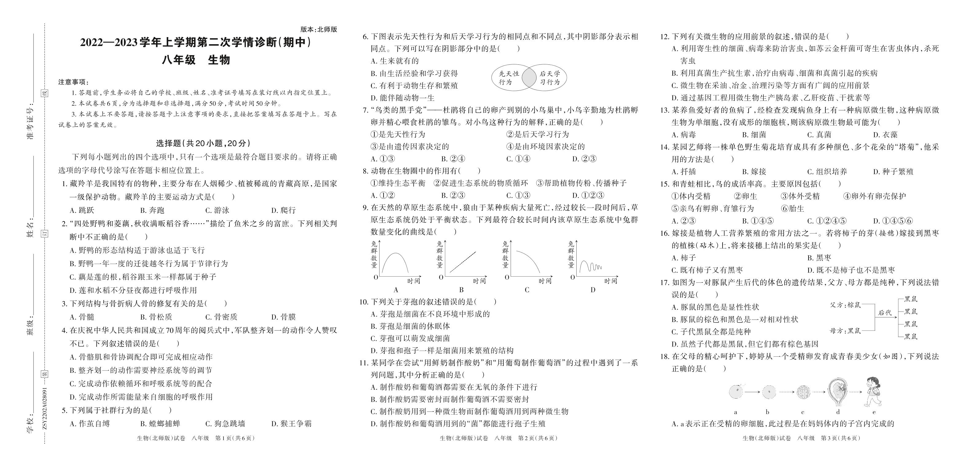 河南省林州红旗渠大道学校2022-2023学年上学期第二次学情诊断卷(期中)八年级生物(北师版)