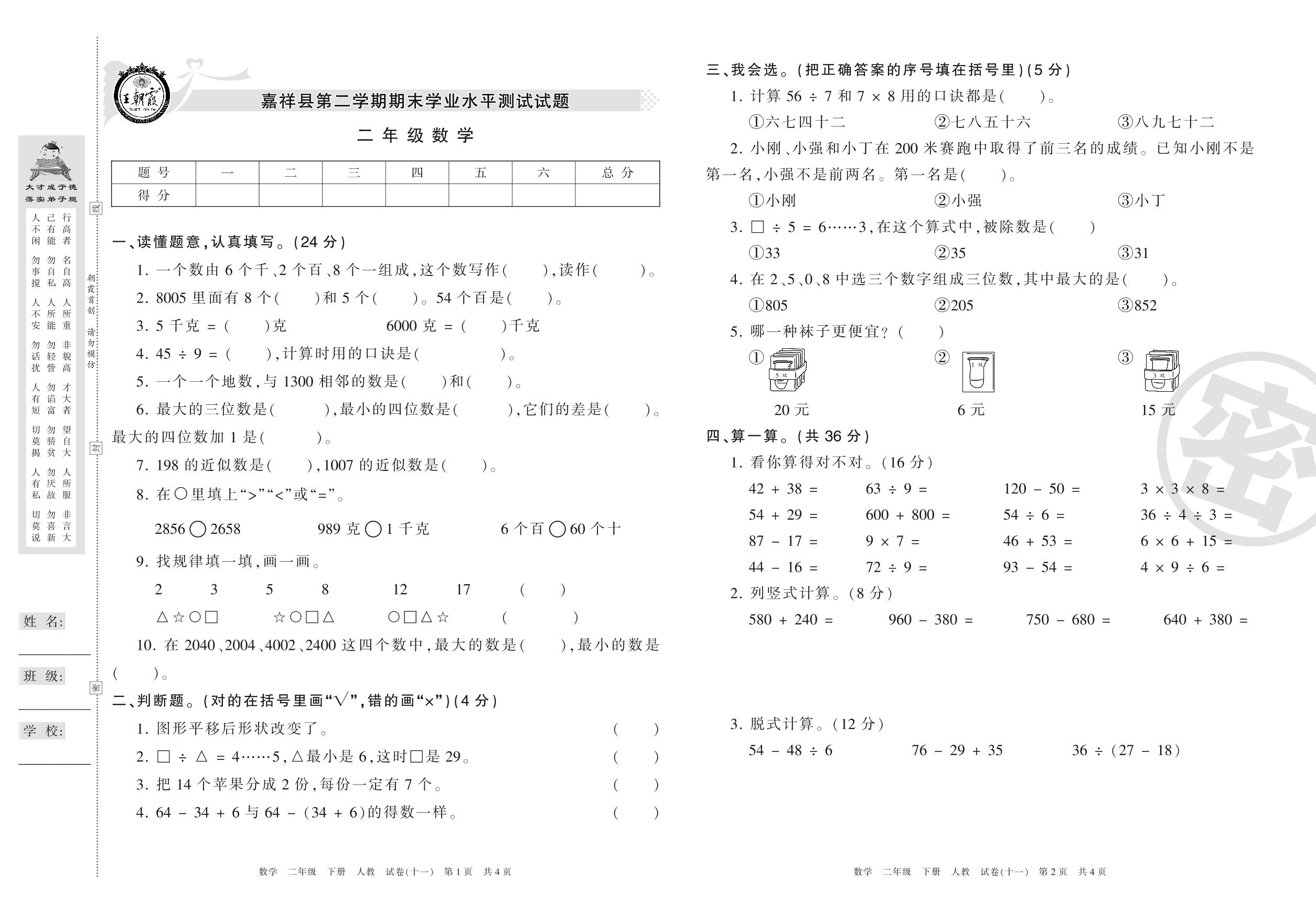 2015-2016学年第二学期济宁市嘉祥县二年级数学试卷(人教版)【11】