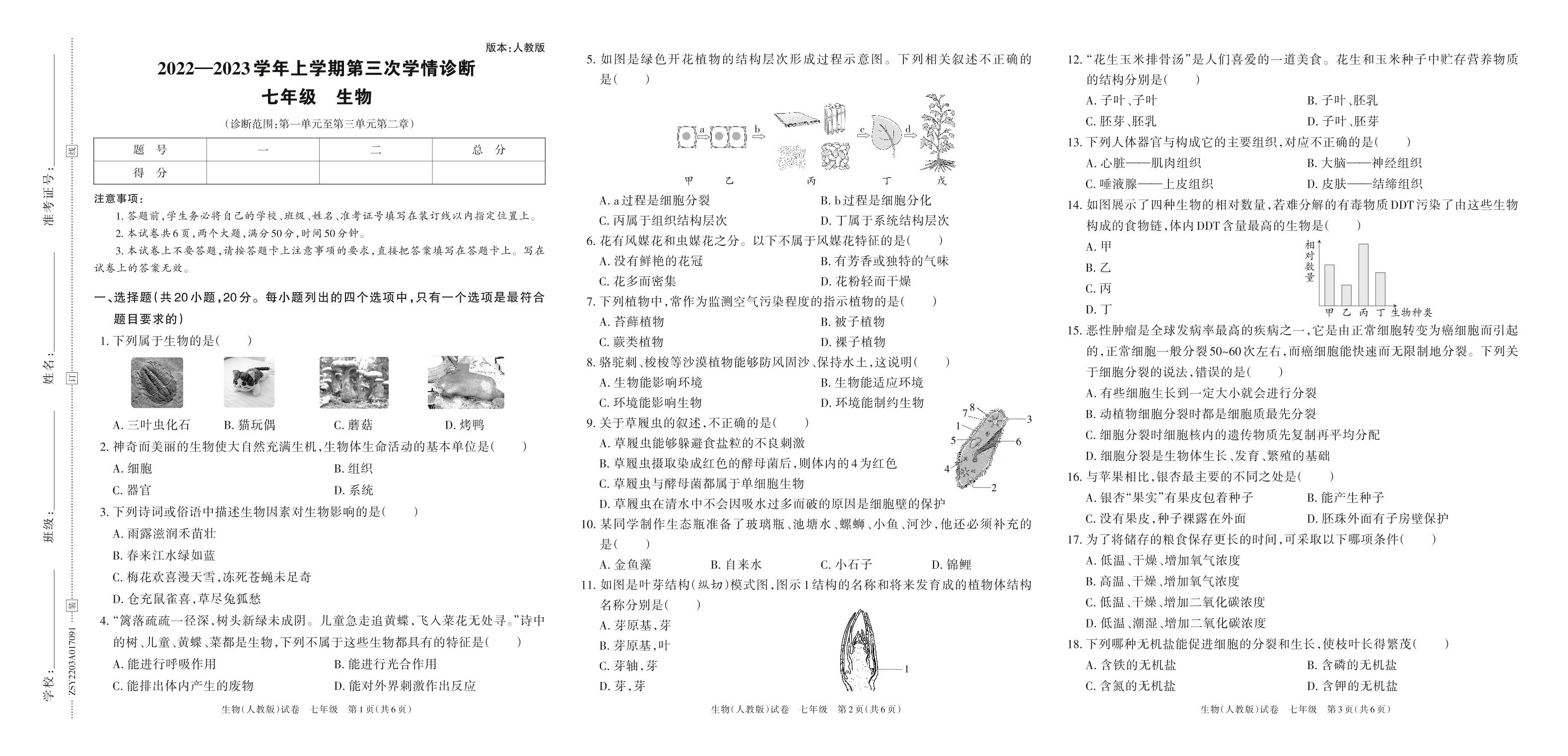 2022—2023学年上学期第三次学情诊断七年级生物(人教版)
