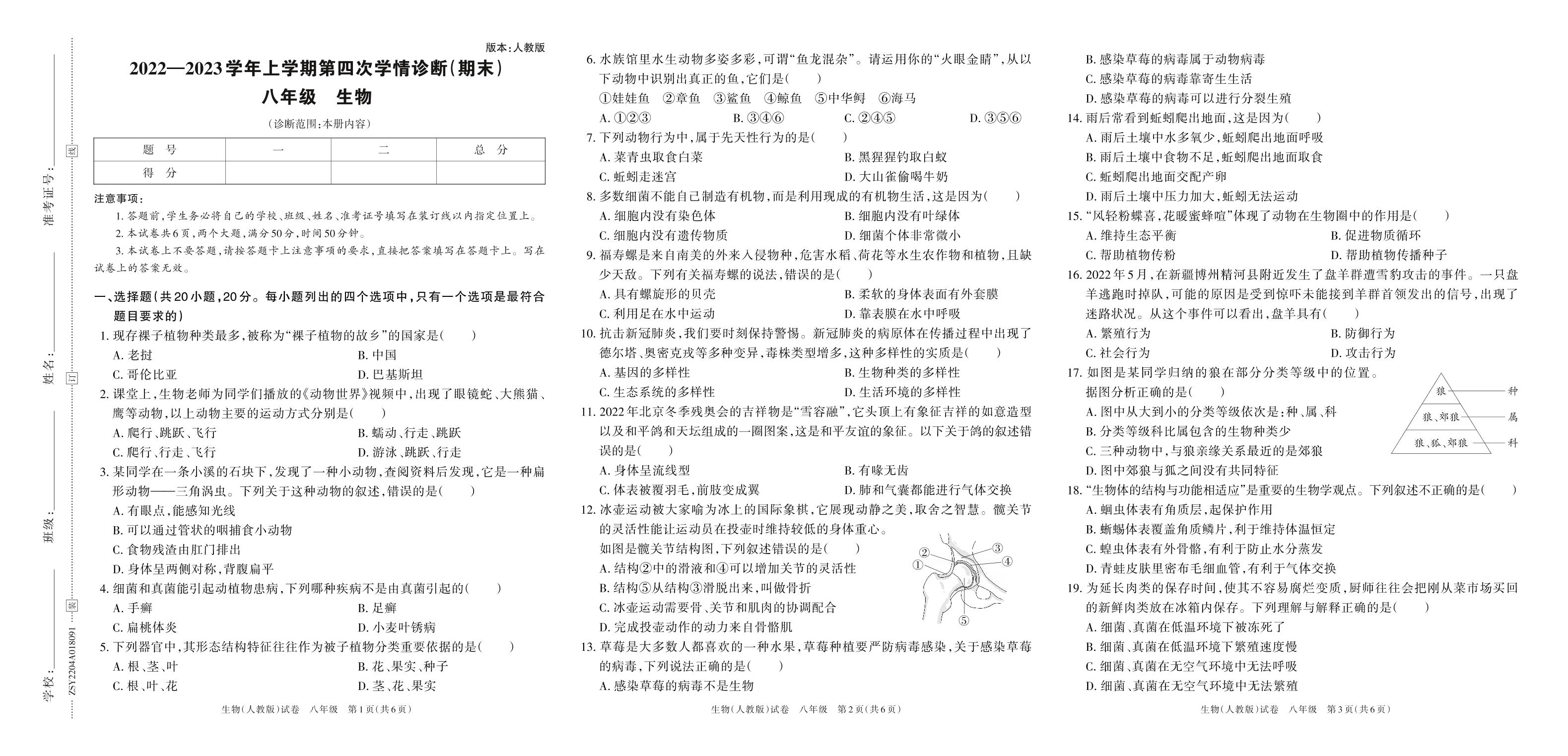 2022—2023学年上学期第四次学情诊断(期末)八年级生物(人教版)