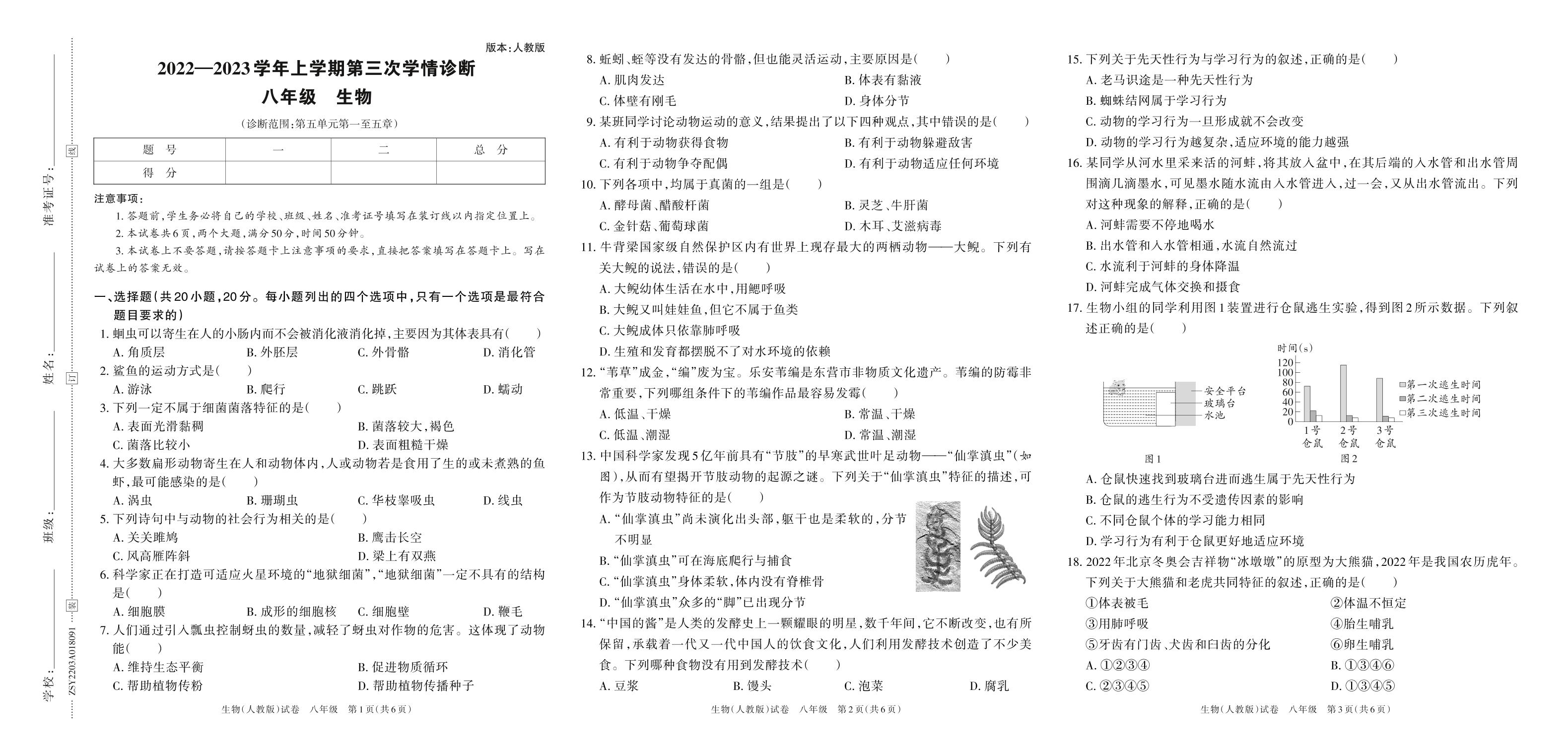 2022—2023学年上学期第三次学情诊断八年级生物(人教版)