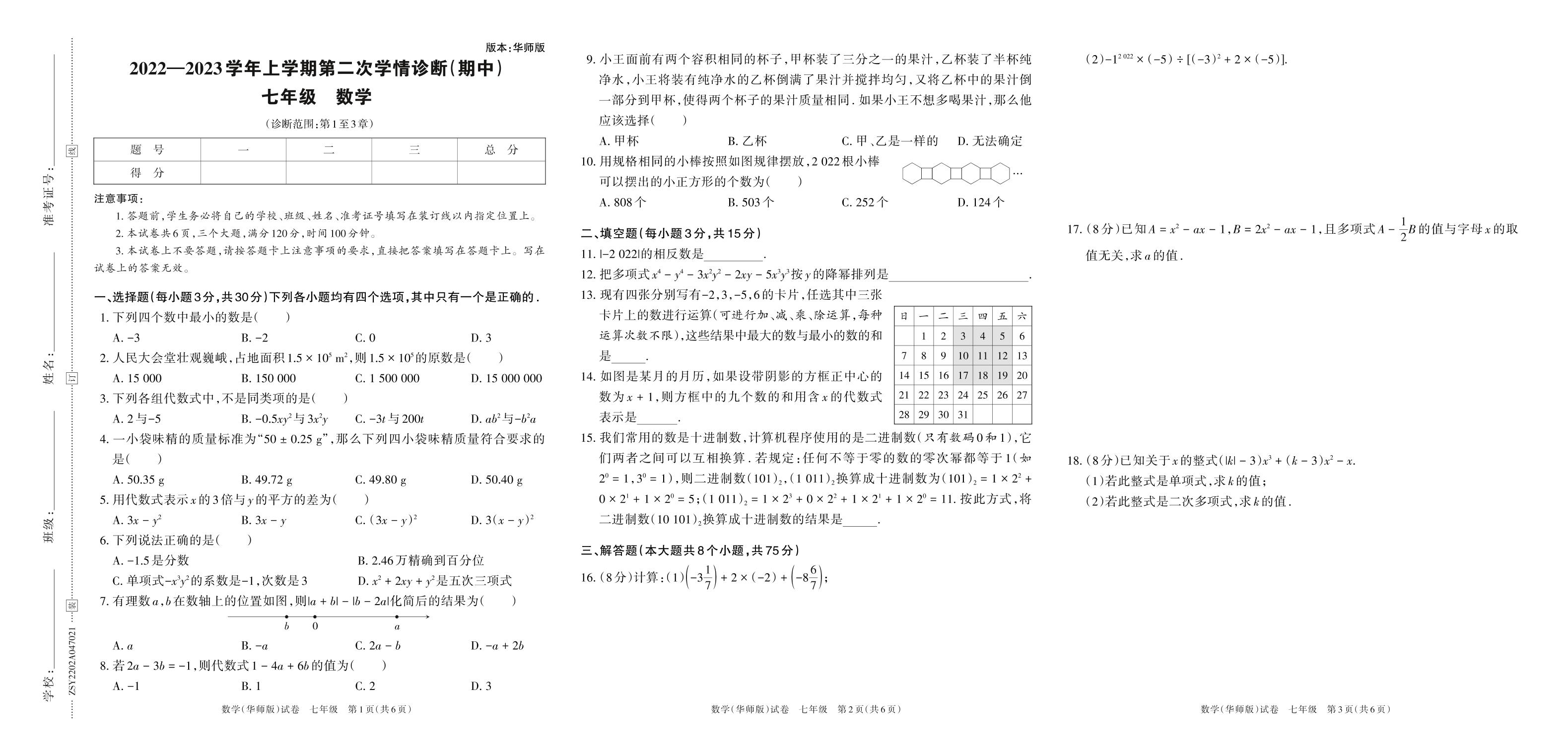 2022—2023学年上学期第二次学情诊断(期中)七年级数学(华师版)