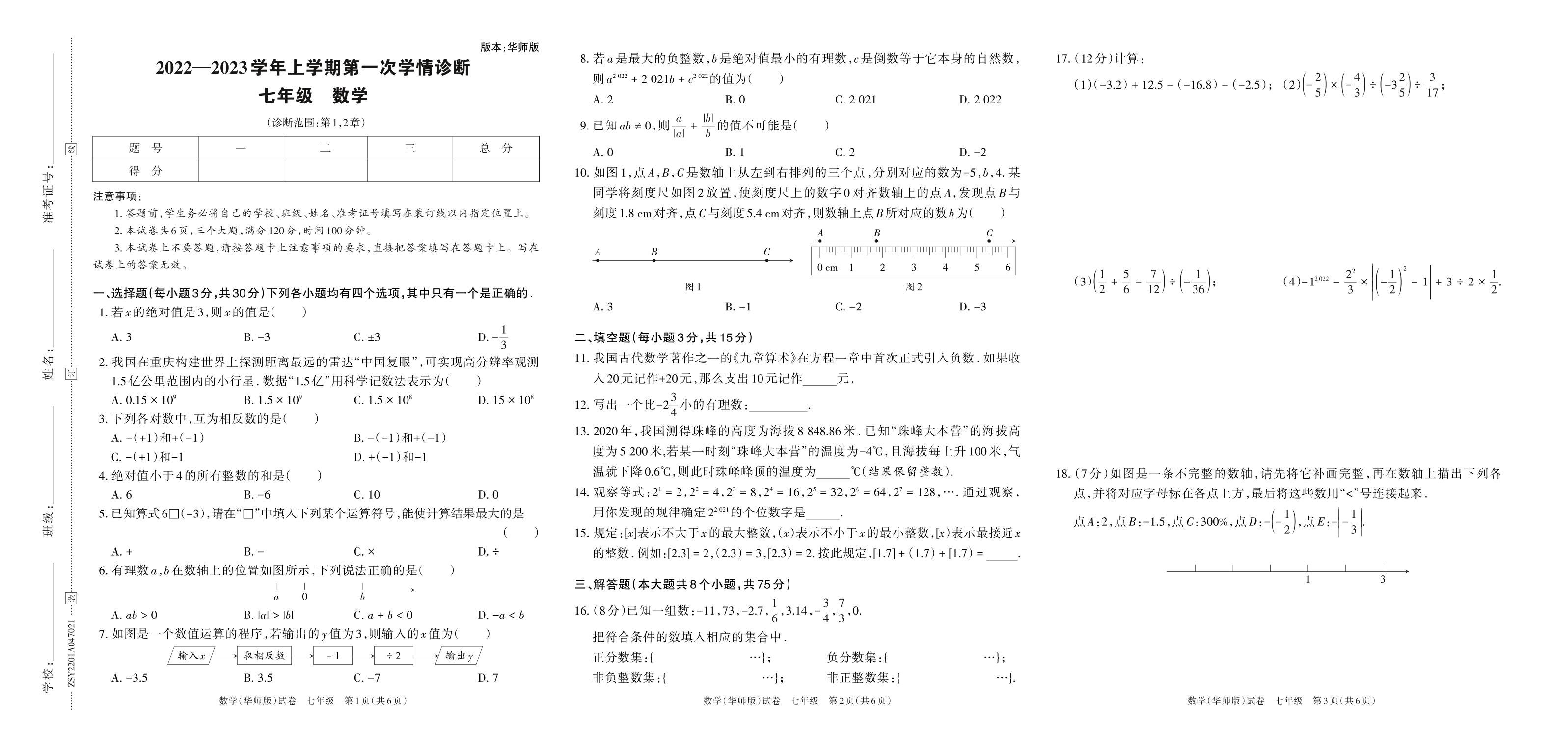 2022—2023学年上学期第一次学情诊断七年级数学(华师版)