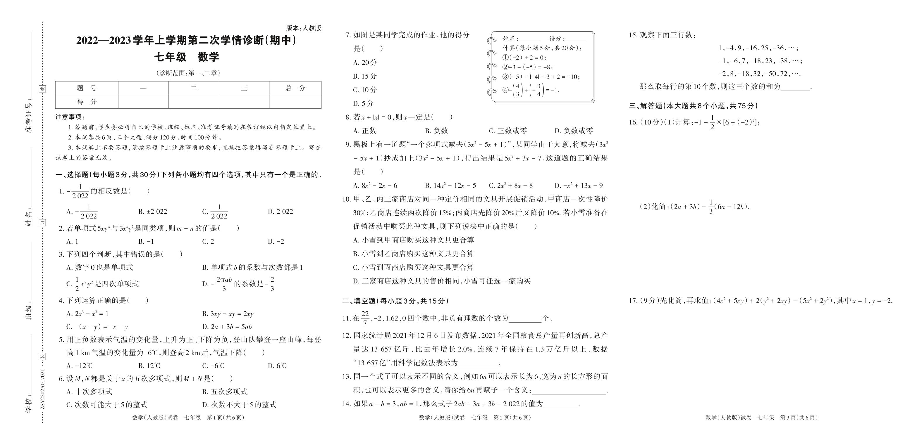 2022—2023学年上学期第二次学情诊断(期中)七年级数学(人教版)