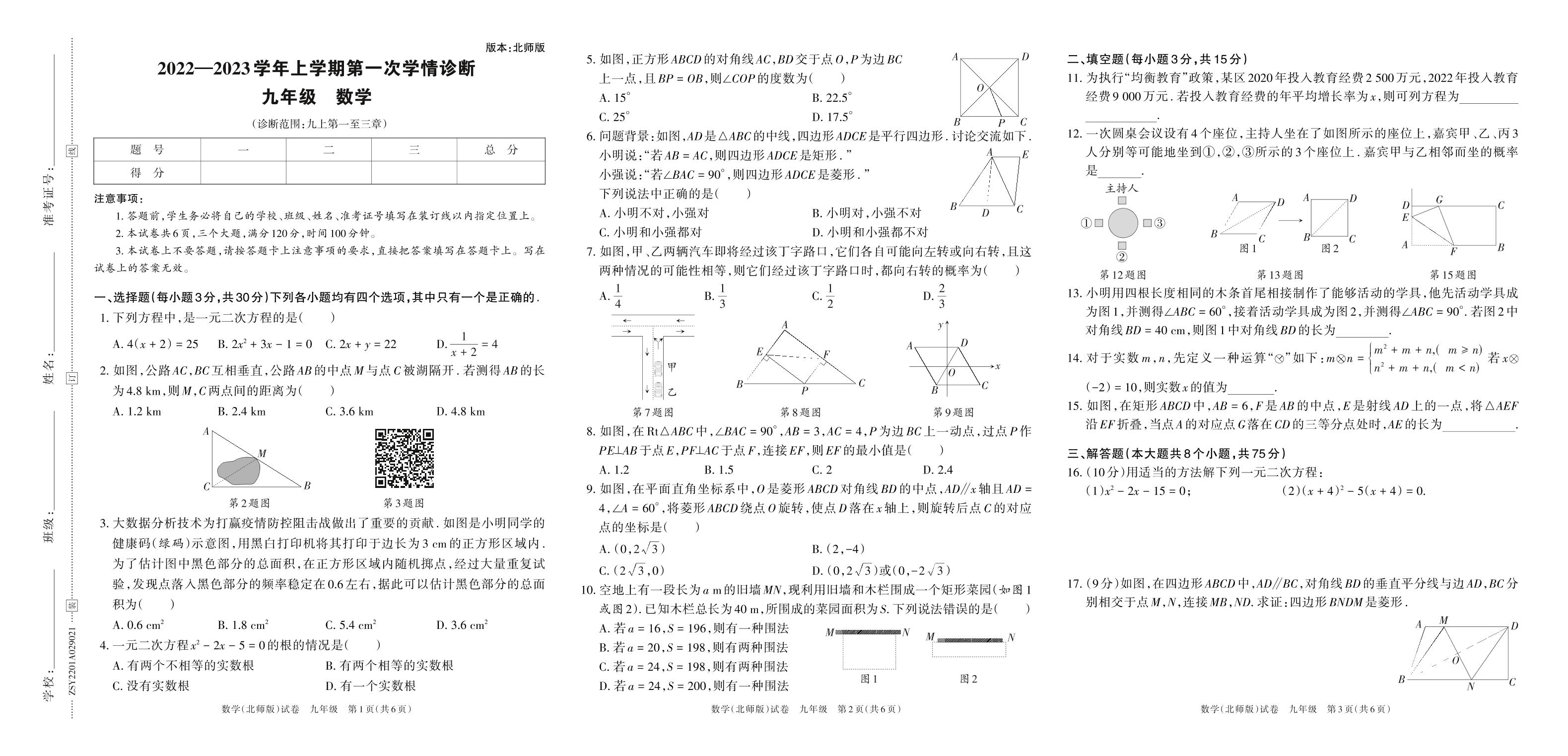 2022—2023学年上学期第一次学情诊断九年级数学(北师版)