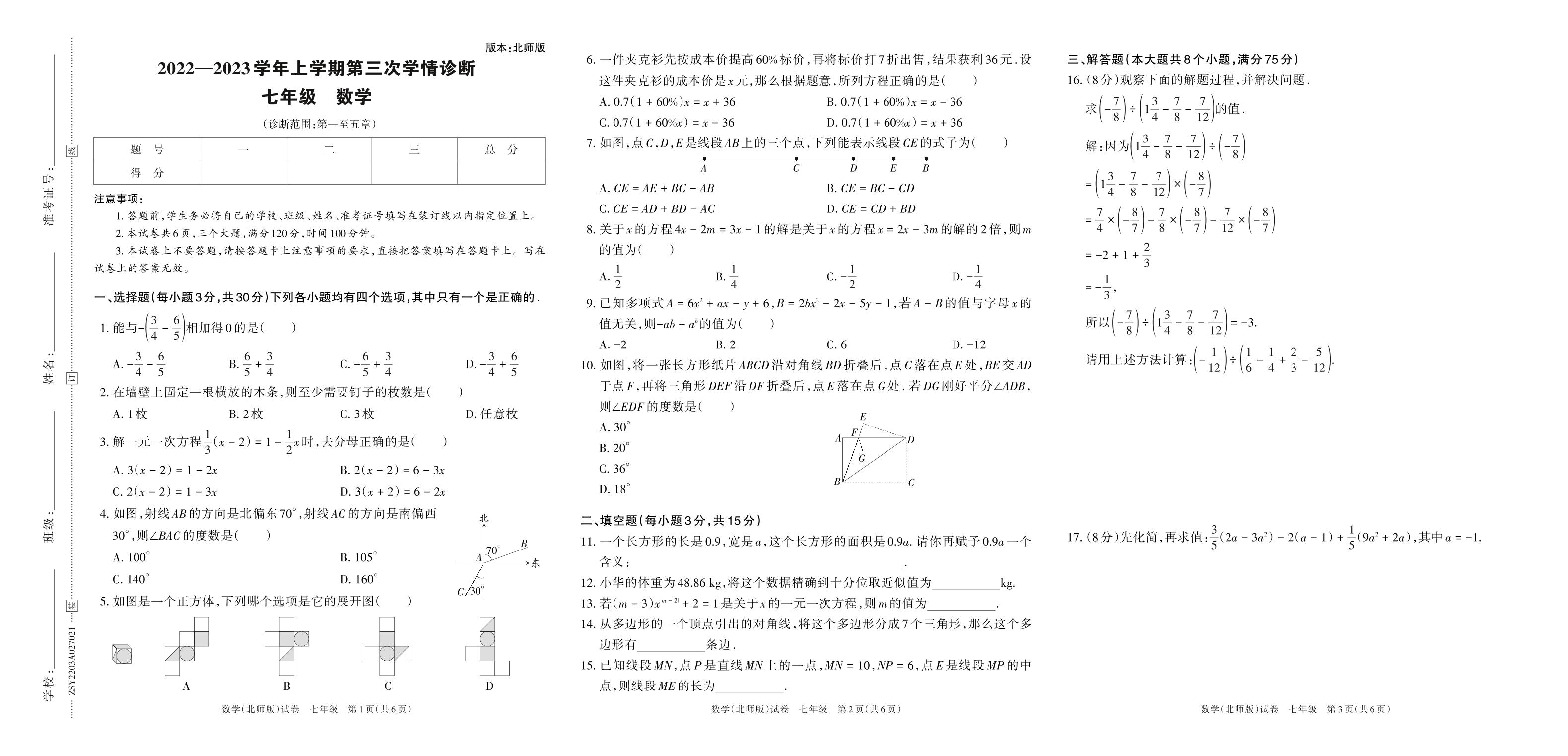 2022—2023学年上学期第三次学情诊断七年级数学(北师版)