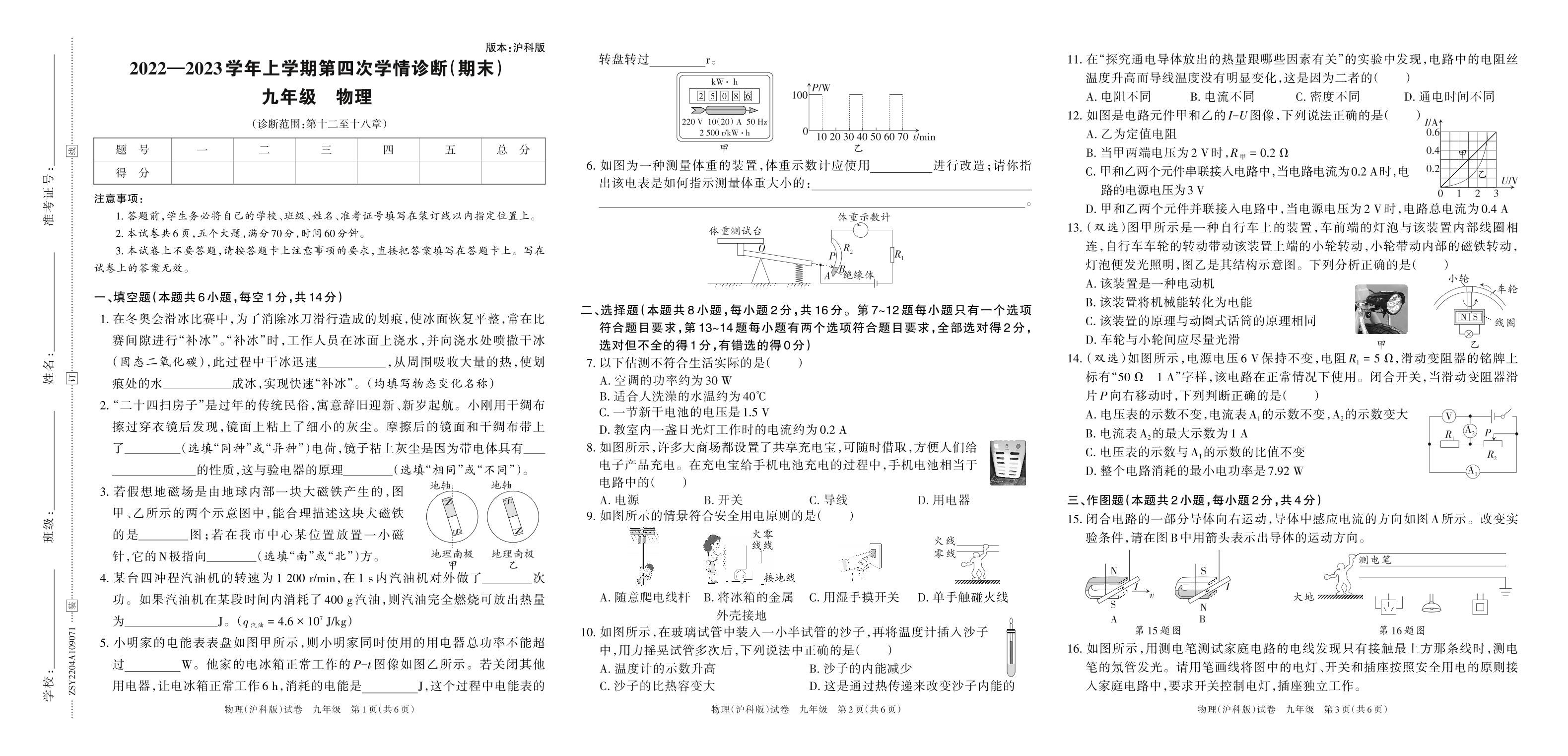 2022—2023学年上学期第四次学情诊断(期末)九年级物理(沪科版)